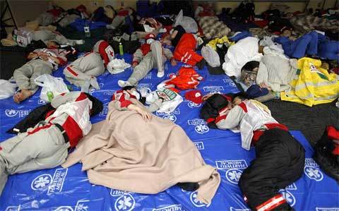 Các nhân viên y tế Hội chữ thập đỏ nghỉ vài giờ trên sàn nhà sau những ca làm việc dài 20h để giúp đỡ bệnh nhân ở bệnh viện Ishinomaki.