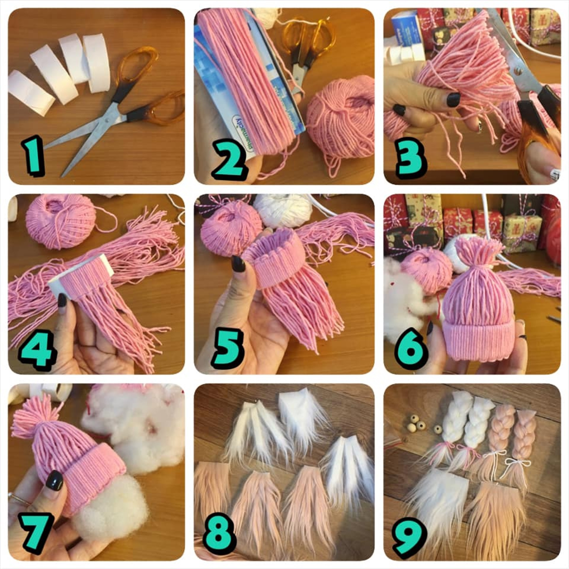 Đầu tiên ấn bẹt lõi giấy vệ sinh và cắt thành 5 phần bằng nhau. Tiếp đến, cắt len thành sợi dài khoảng 22 - 26cm để làm mũ len của thần lùn. Gập đôi sợi len và thắt bao quanh lõi giấy vệ sinh vừa cắt. Khi kín lõi giấy, lộn ngược len vào trong để tạo thành viền mũ. Nhồi bông vào trong để tạo độ phồng rồi buộc túm phía trên tạo thành quả bông trên đỉnh mũ.