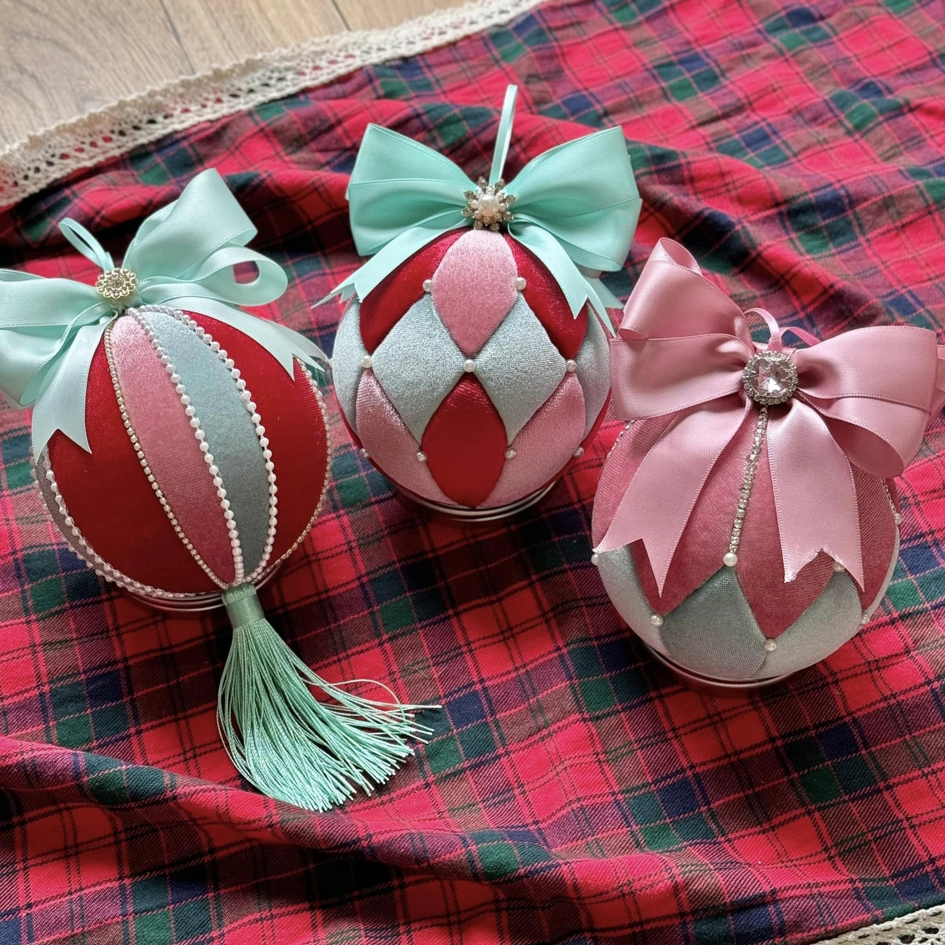 Sau khi ghép xong các mảnh vải nhung theo màu phối như ý, trang trí thêm ruy băng, nơ và dán charm bằng keo nến tuỳ theo sở thích (hoặc tìm mẫu trên mạng) là hoàn thành quả châu trang trí cây thông độc đáo và đẹp sang chảnh.