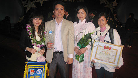 | Phương Thảo (thứ 2 từ phải sang) cùng các bạn trong nhóm nghiên cứu đề tài cùng thầy hướng dẫn Nhạc Phan Linh tại Festival sáng tạo trẻ 2010 do Thành đoàn Hà Nội tổ chức. |