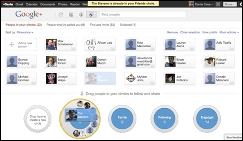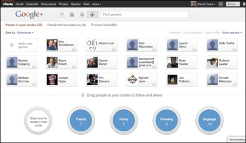 Tính năng Circles hiện đang rất hút khách trên Google+. Để bắt đầu, hãy kéo thả tên bạn bè vào từng vòng tròn khác nhau. Ý tưởng của Circles rất gần gũi cuộc sống thực khi mỗi người đều có nhiều nhóm bạn khác nhau và được tương tác riêng biệt. Chắc chắn đây chính là điểm cộng đánh trúng nhu cầu của người dùng.