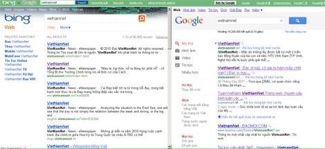 Bạn rất hâm mộ Google nhưng vẫn muốn dùng thử Bing? Chẳng phải mất thời gian truy cập đồng thời 2 trang web trên, bạn hãy tìm đến địa chỉ http://www.bing-vs-google.com/... Nhập từ khóa vào ô tìm kiếm và nhấn Enter. Kết quả trả lại bao gồm 2 cột, bên trái thuộc về Bing còn bên phải thuộc về Google.
