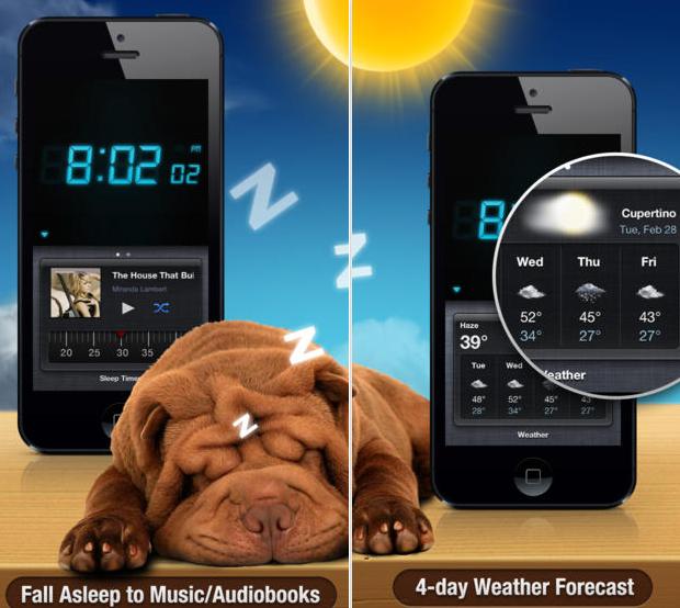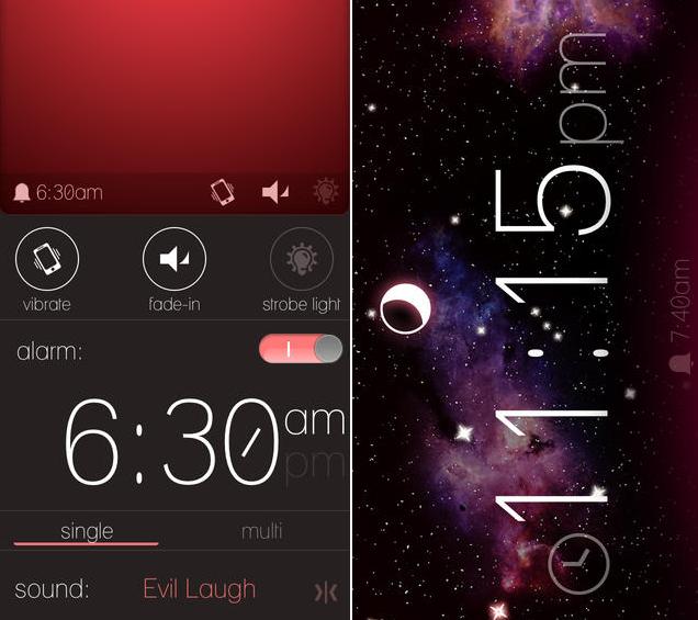 Rise Alarm Clock là một ứng dụng báo thức đơn giản nhưng đẹp mắt. Ứng dụng được điều chỉnh hoàn toàn bằng cử chỉ. Bạn có thể vuốt màn hình từ bên này sang bên kia để tắt ứng dụng. Vuốt màn hình lên trên hoặc xuống dưới đề đặt giờ báo thức. Bạn có thể chọn bản nhạc bất kỳ trong thư viện iTunes để làm nhạc chuông. Bạn cũng có thể tạo một danh sách nhạc từ iTunes để nghe buổi tối cho dễ ngủ (nhạc sẽ được hẹn giờ tắt để không phát cả đêm). Rise Alarm Clock có thiết đặt cho người dùng thuận tay trái.