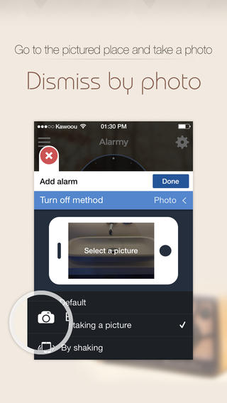 Alarmy là ứng dụng tuyệt vời cho những ai luôn gặp khó khăn để thức dậy vào mỗi buổi sáng. Ứng dụng hoạt động như sau: Bạn chụp ảnh một đồ vật trong nhà, như chậu rửa bát trong nhà bếp hoặc tivi trong phòng khách. Mỗi sáng, bạn sẽ phải ra khỏi giường và đi chụp ảnh đồ vật đó thì chuông báo thức mới tắt.