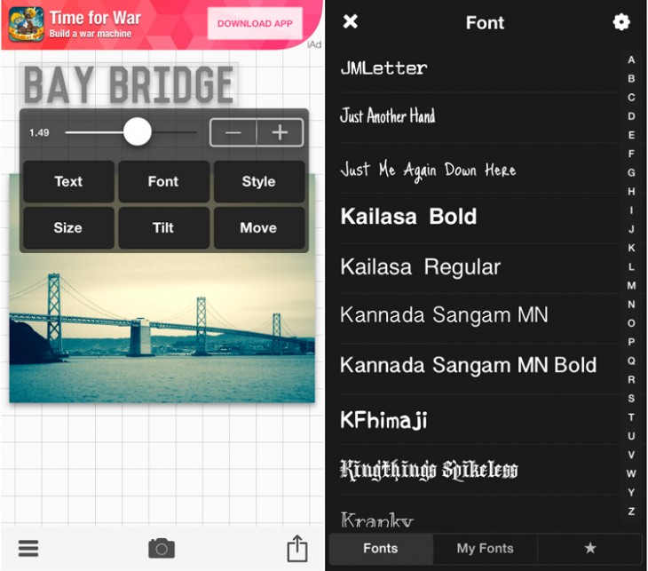Phonto là ứng dụng đơn giản để trang hoàng bức ảnh của bạn bằng nhiều phông chữ đẹp mắt, bên trong các bong bóng, thiệp hay huy hiệu. Ngoài ký tự, phần mềm còn có cả sticker như các ngôi sao, trái tim nhiều màu sắc, góc độ. Bạn dùng ngón tay hoặc mũi tên để di chuyển các họa tiết hoặc đổi cỡ chữ, màu chữ.