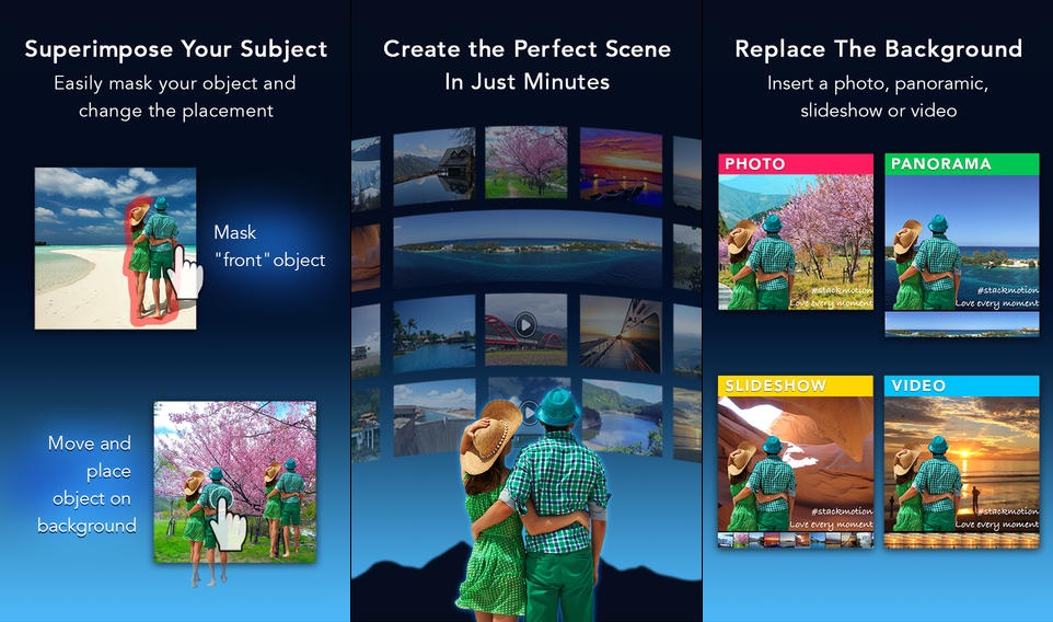 StackMotion là ứng dụng chỉnh sửa ảnh với nhiều tính năng độc đáo. Với StackMotion, bạn có thể tách rời chủ thể chính trong bức ảnh, sau đó thay thế hình nền bằng một bức ảnh khác, slide show, video hoặc một bức ảnh chụp toàn cảnh (panorama). Ngoài ra, bạn có thể chèn thêm nhạc hoặc ghi chú dạng văn bản vào ảnh.
