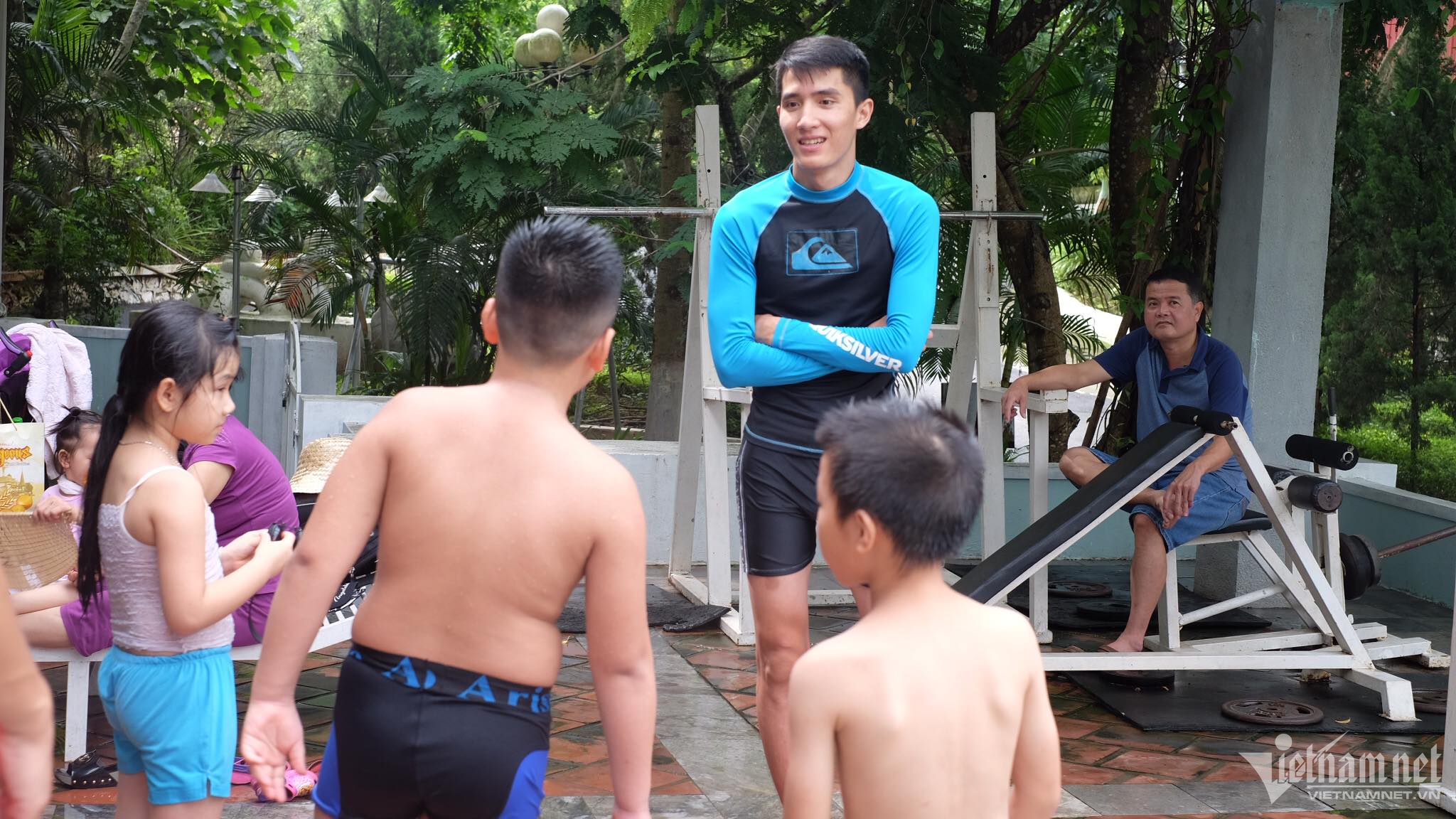 Đào Tuấn Tùng hướng dẫn học viên nhí các kỹ năng trước khi xuống bể bơi.
