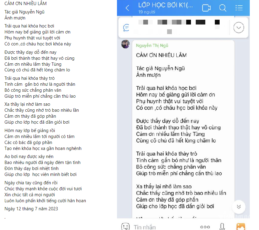 Bài thơ được bà của một học viên dành tặng thầy Tùng.Trong buổi tổng kết giao lưu ở nhà văn hóa xã khi kết thúc khóa dạy bơi miễn phí, Tùng nhận được nhiều món quà cảm ơn từ ban lãnh đạo thôn và phụ huynh.