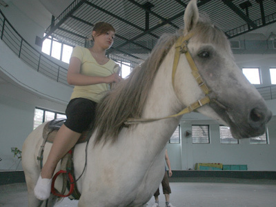 Nhật Anh trên sân tập diễn xiếc với ngựa.