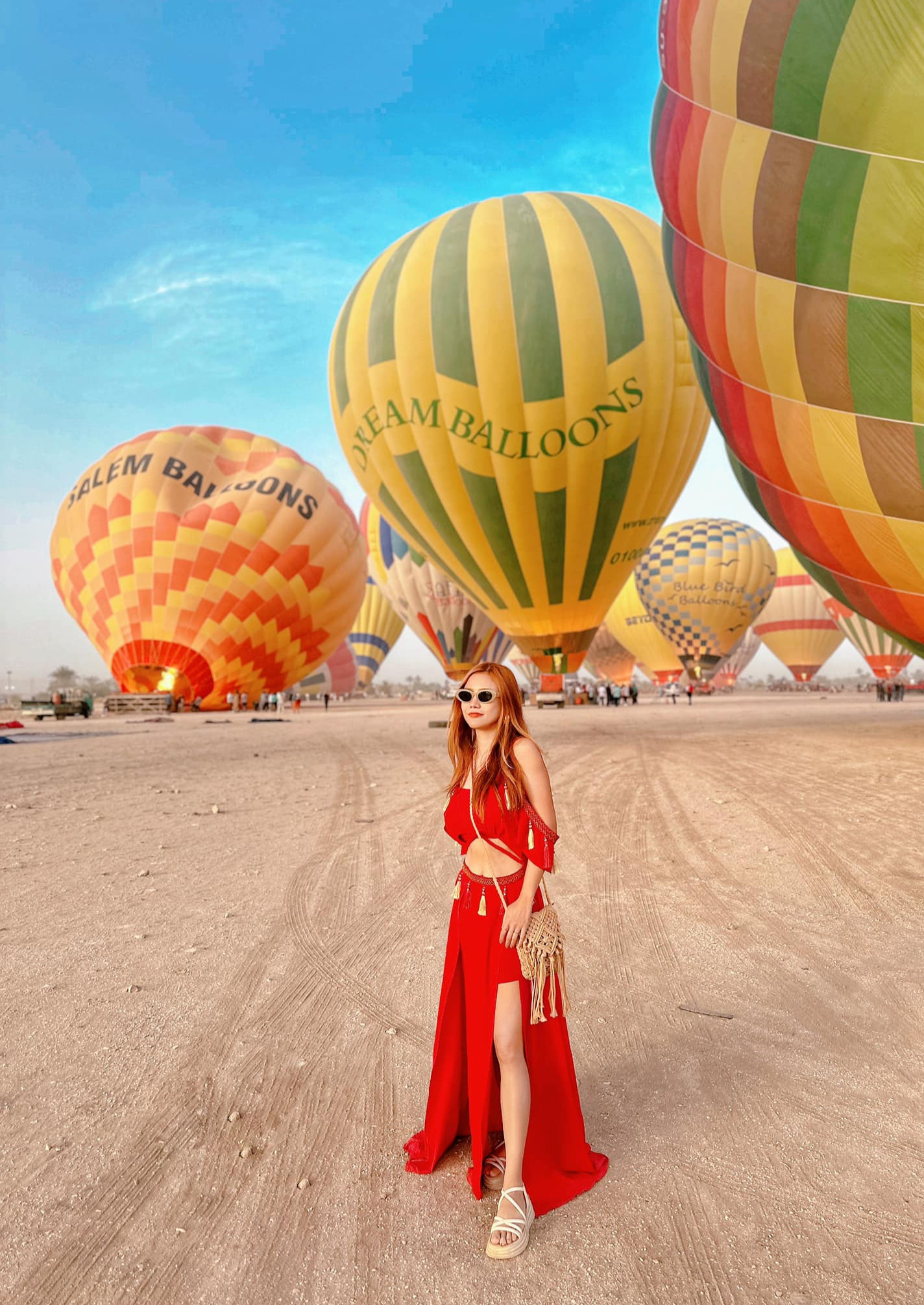 Nữ du khách Việt trải nghiệm bay khinh khí cầu lúc 4h30 sáng, ngắm bình minh từ trên cao tại Luxor. Đây là một trong những địa điểm bay khinh khí cầu rẻ nhất thế giới với chi phí khoảng 45-60 USD (1,1 – 1,5 triệu đồng)/lượt bay.