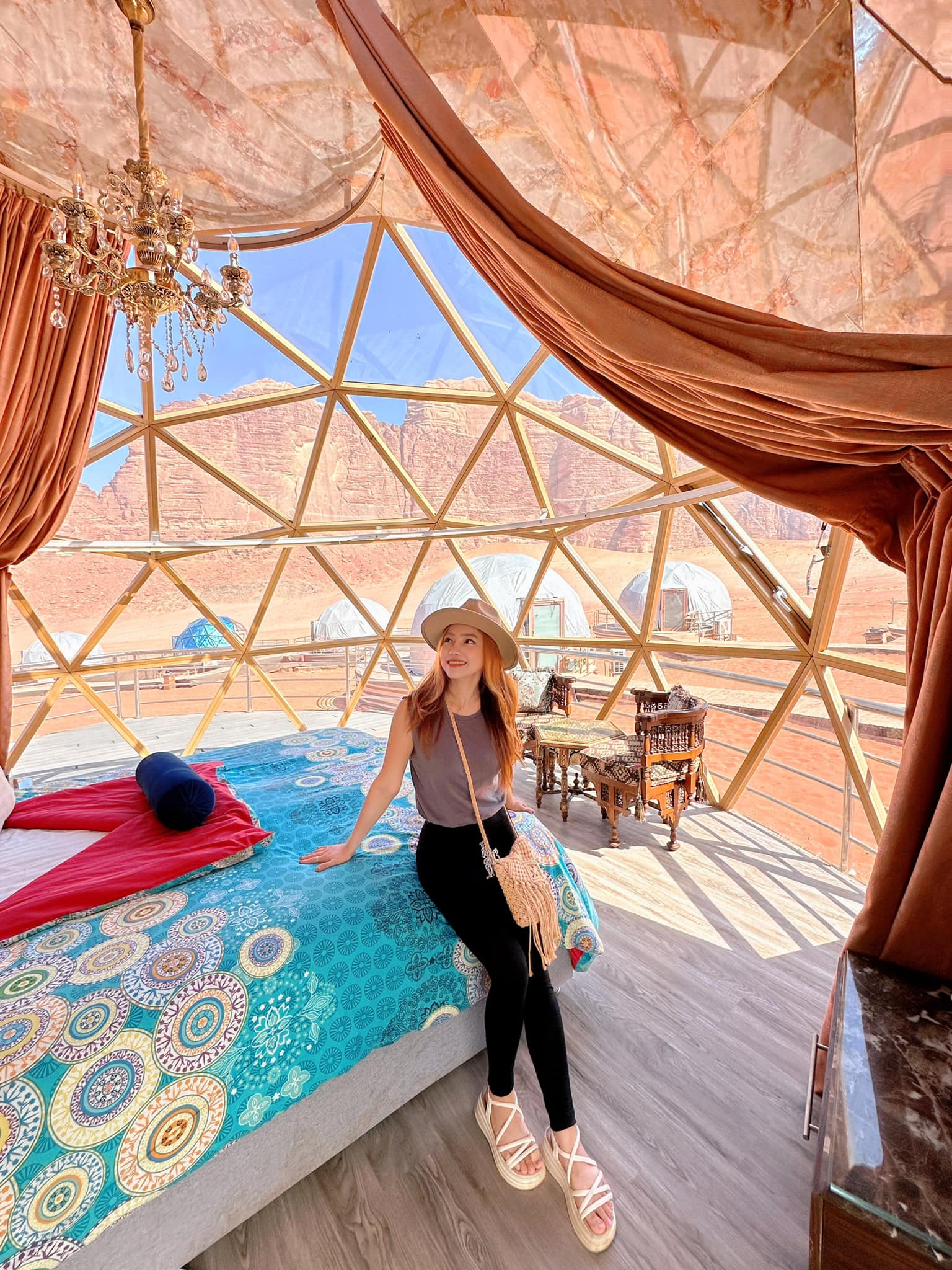 Để có thêm thời gian và trải nghiệm tại “hành tinh cát”, chị Điệp còn lựa chọn lưu trú qua đêm trong những chiếc lều bong bóng nằm giữa sa mạc Wadi Rum với giá 15 triệu đồng/đêm.