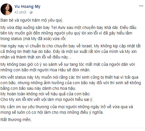| Ảnh chụp màn hình trạng thái của Hoàng My, hiện nay người đẹp đã xóa bài đăng này. |