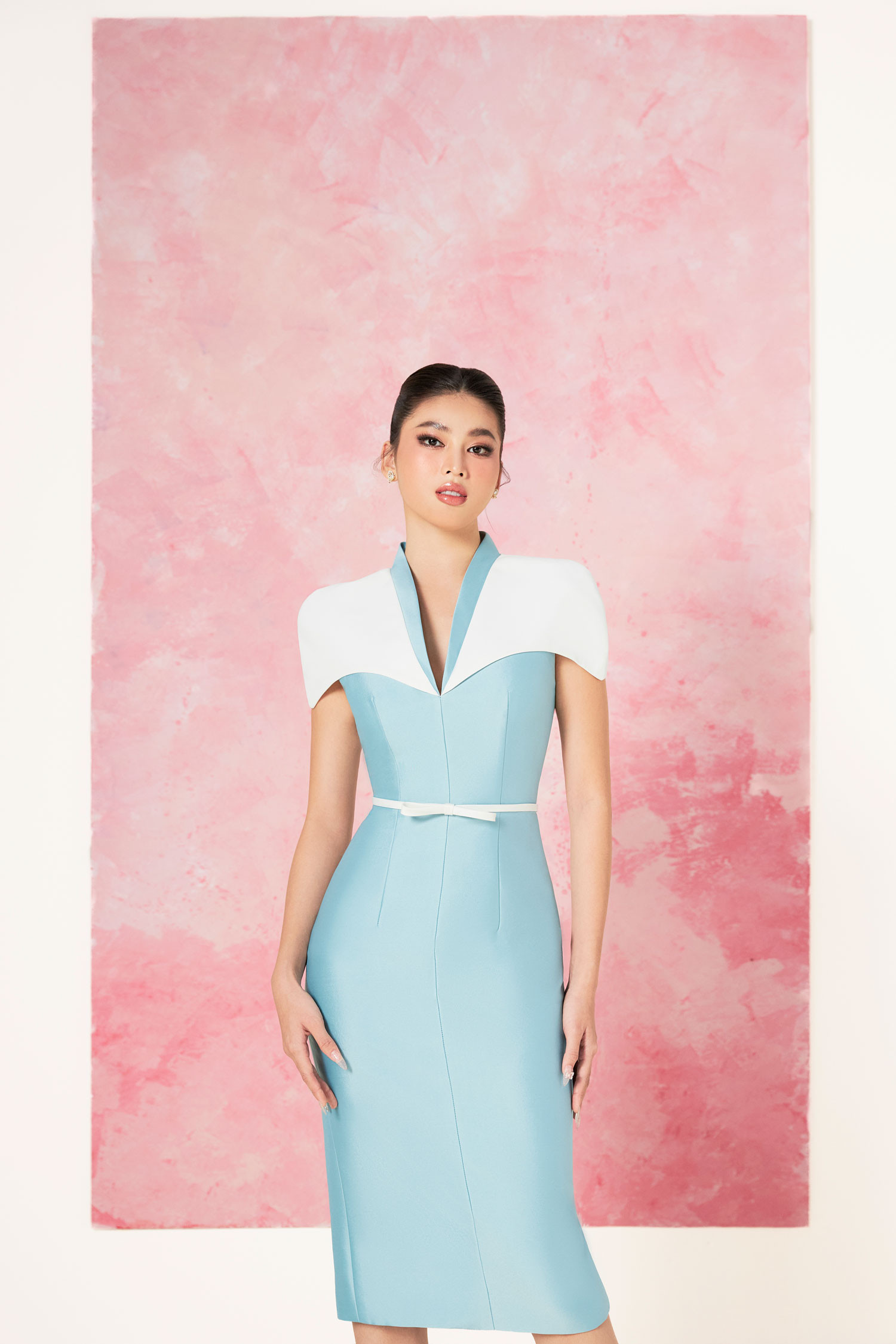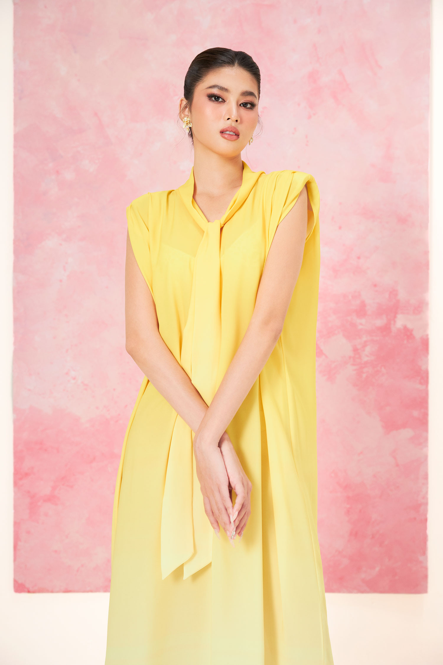 Với các dáng váy dài quá gối, nhà thiết kế ứng dụng những chi tiết như nơ thắt cổ áo để tổng thể mềm mại, nhẹ nhàng hơn.