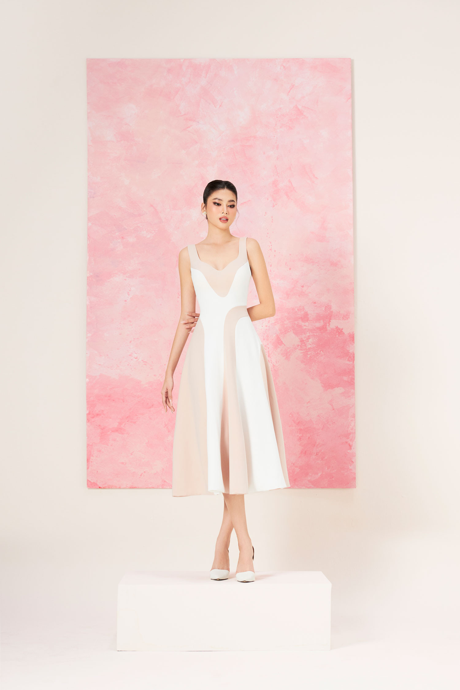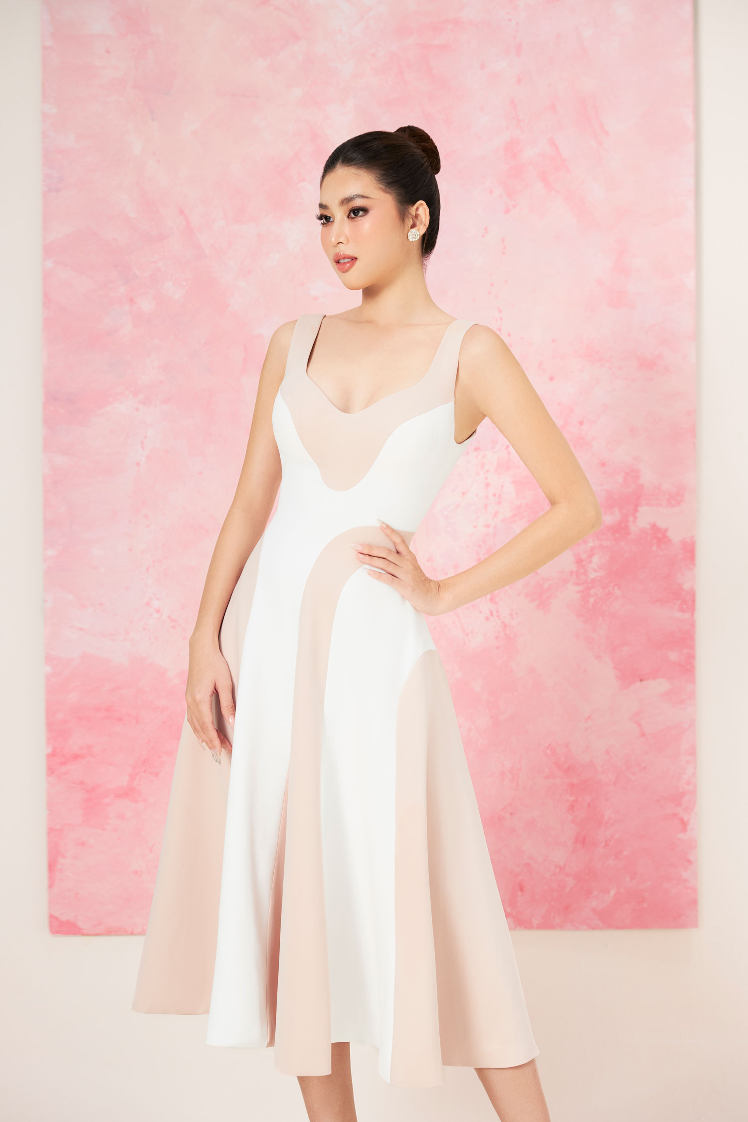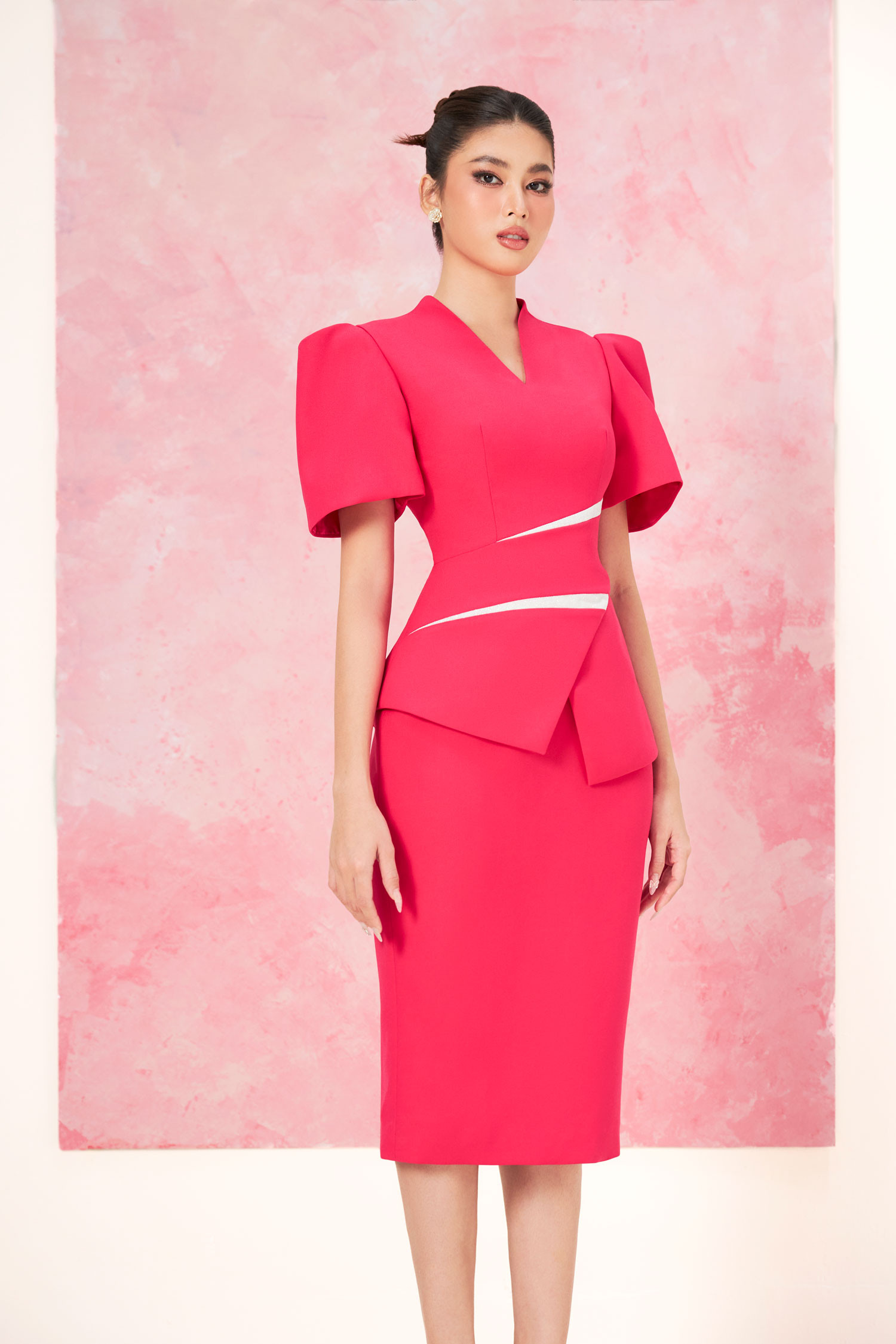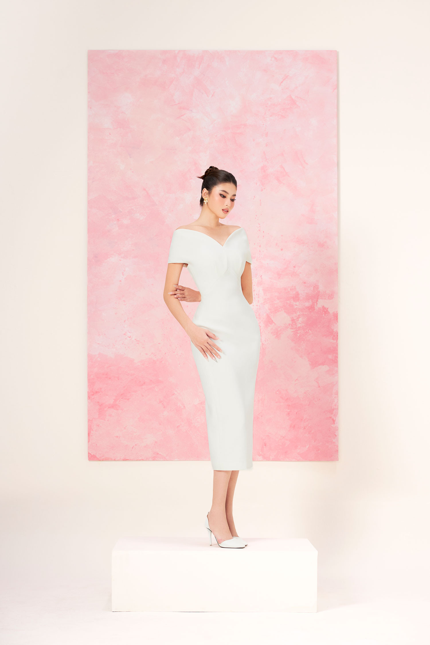 Các điểm nhấn xẻ ngực, trễ vai được tiết chế vừa phải, nhằm tôn vinh khéo léo đường cong người mặc.