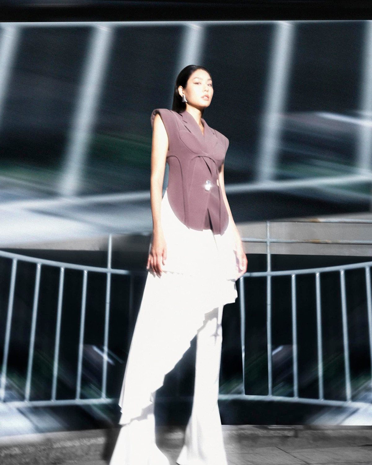 Á hậu Thảo Nhi Lê diện trang phục độc đáo của nhà thiết kế Cường Đàm trong bộ ảnh được đăng trên tạp chí Vogue Singapore số tháng 10 để lan toả thông điệp về thời trang hướng tới tương lai.