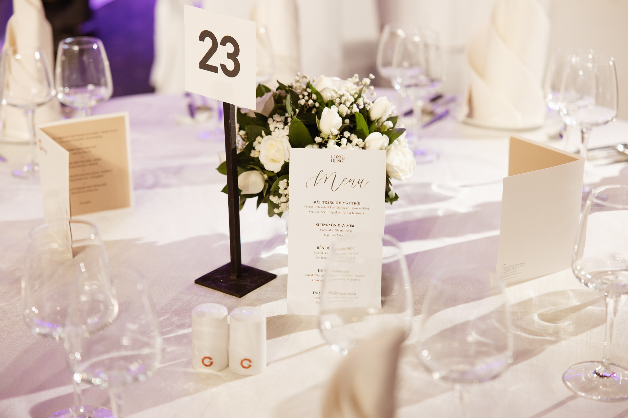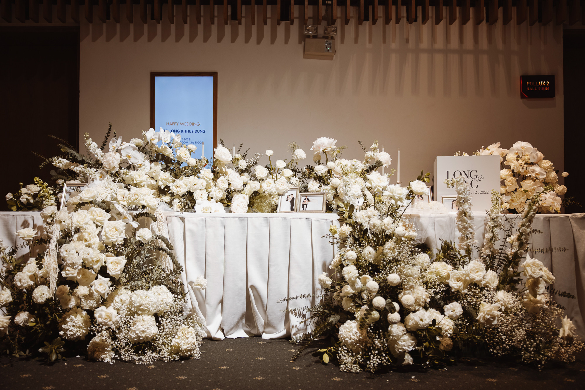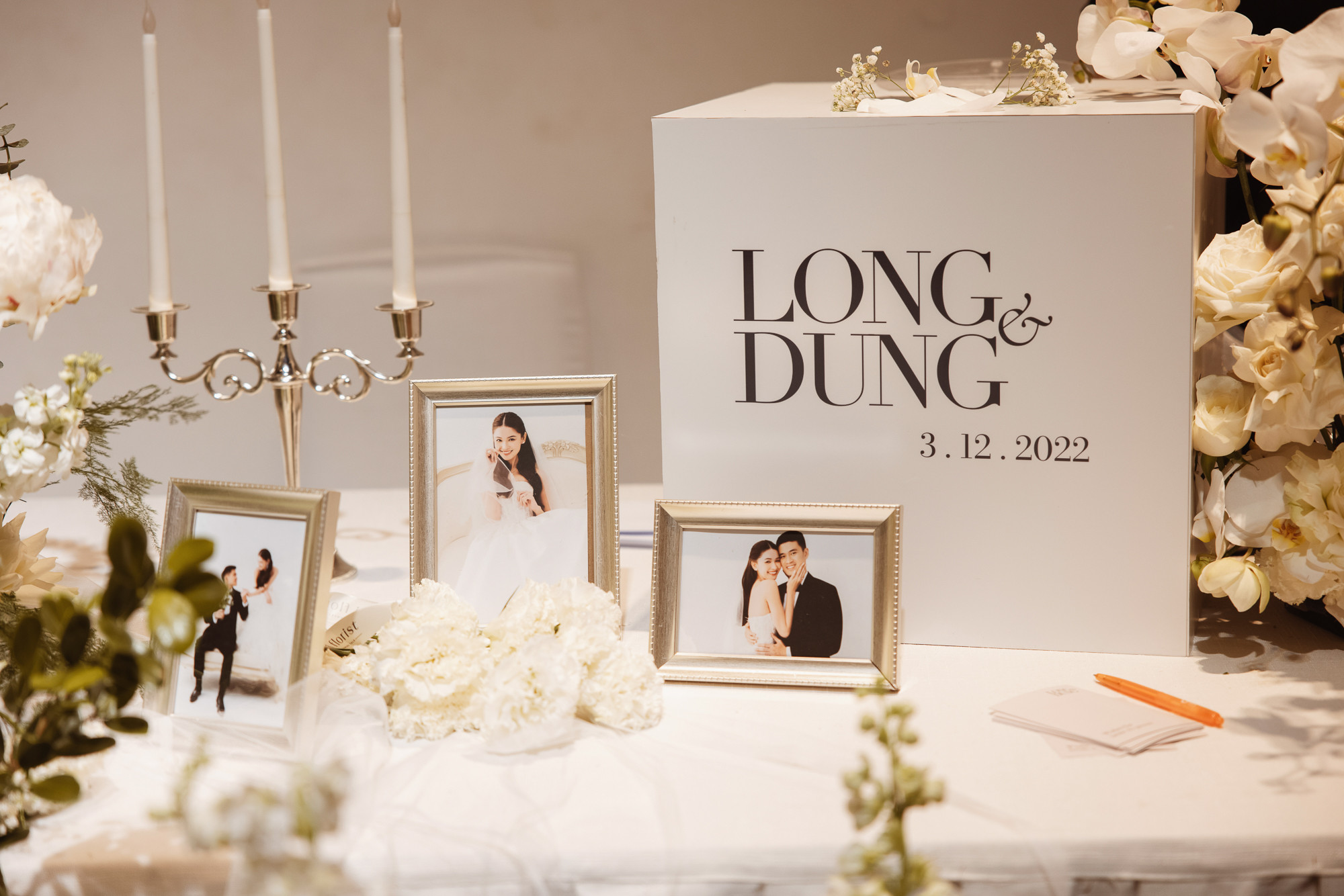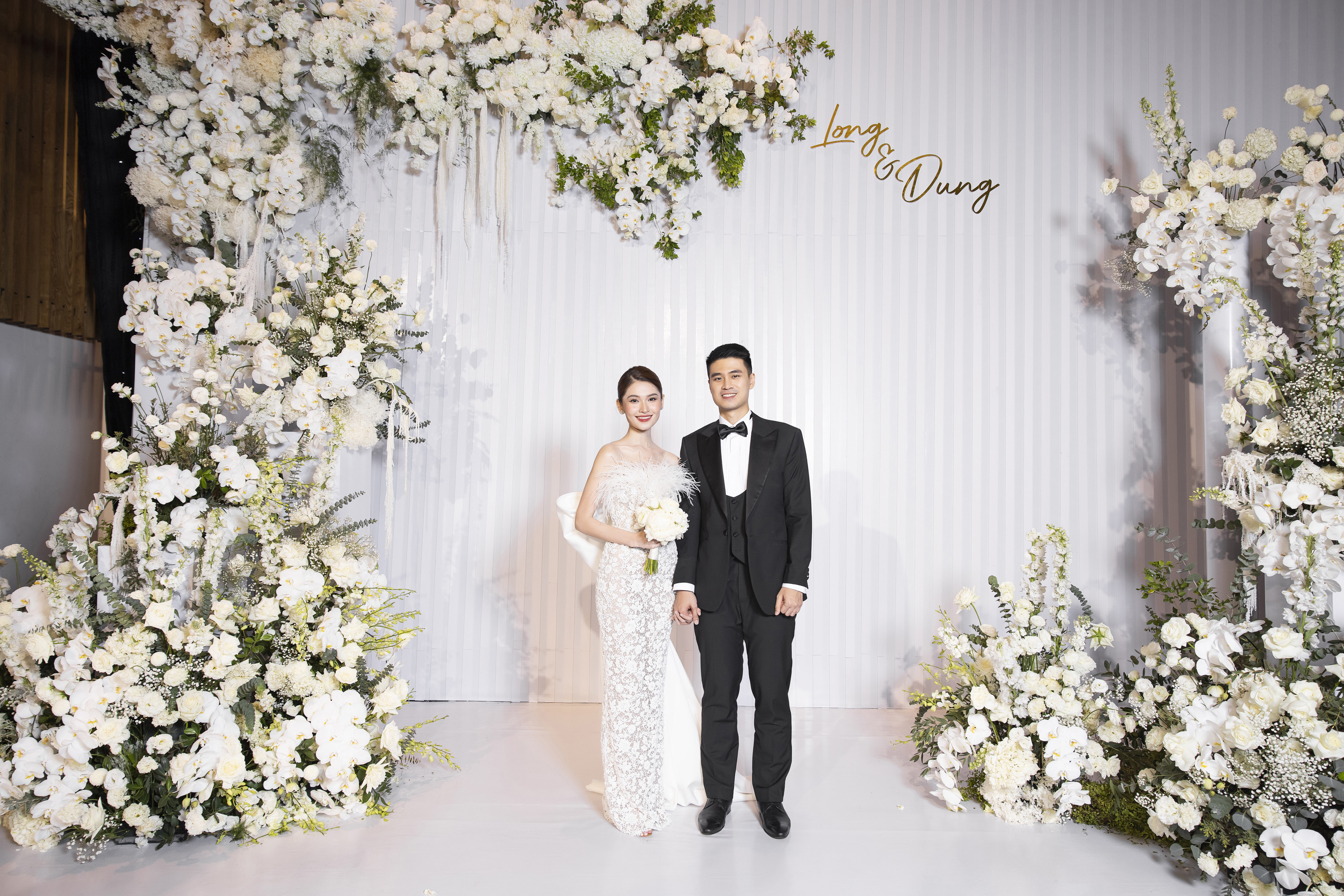 Tối 3/12, á hậu Thùy Dung và doanh nhân Thái Long chính thức tổ chức tiệc cưới cùng gia đình, bạn bè, đồng nghiệp tại TP.HCM.Khu vực đón khách sử dụng nhiều hoa tươi trang nhã với tông trắng chủ đạo. Bàn tiệc xuất hiện những tấm ảnh lưu giữ kỷ niệm ngọt ngào, hạnh phúc của Thuỳ Dung cùng ông xã. Thùy Dung chọn hoa hồng trắng đính kết nhẹ nhàng tạo cảm giác ấm cúng. Cặp đôi mong muốn hôn lễ diễn ra trong không gian thuần khiết, tinh khôi.Buổi tiệc sang trọng, lãng mạn cùng lễ đường lung linh màu sắc nhận được sự quan tâm của khán giả. Á hậu Thuỳ Dung diện 3 mẫu váy cưới cưới nhẹ nhàng, thanh lịch, từng chi tiết đá được đính kết tỉ mỉ. Cô tự tin khoe nhan sắc ngọt ngào bên chồng doanh nhân điển trai cao 1,83 m.Chồng của Thùy Dung khiến mọi người chú ý và dành nhiều lời ngưỡng mộ vì xứng đôi. Hai người nắm tay tình tứ, đón tiếp gia đình hai bên, bạn bè thân thiết tham dự tiệc cưới.Thùy Dung kể do cô kín tiếng chuyện tình cảm hơn 4 năm qua nên chỉ gia đình, bạn bè thân thiết mới biết chân dung ông xã. Đến khi chụp ảnh cưới, êkíp cứ ngỡ chú rể là người mẫu vì anh có chiều cao nổi bật cùng gương mặt điển trai.Chồng sắp cưới của Thùy Dung là doanh nhân trẻ, tốt nghiệp thạc sĩ ĐH Johns Hopkins (Mỹ), hiện làm kinh doanh tại Hà Nội. Ngoài được đánh giá xứng đôi, chuyện tình cảm của cặp đôi này cũng nhận được sự ủng hộ từ phía hai bên gia đình.Trong ngày trọng đại, người đẹp diện các mẫu váy cưới của nhà thiết kế Lê Thanh Hòa. Các trang phục mang đến vẻ nhẹ nhàng, thanh lịch cho cô dâu với 2 kiểu dáng cúp ngực, khăn voan cài đầu rộng và thiết kế lệch vai, dáng đuôi cá.