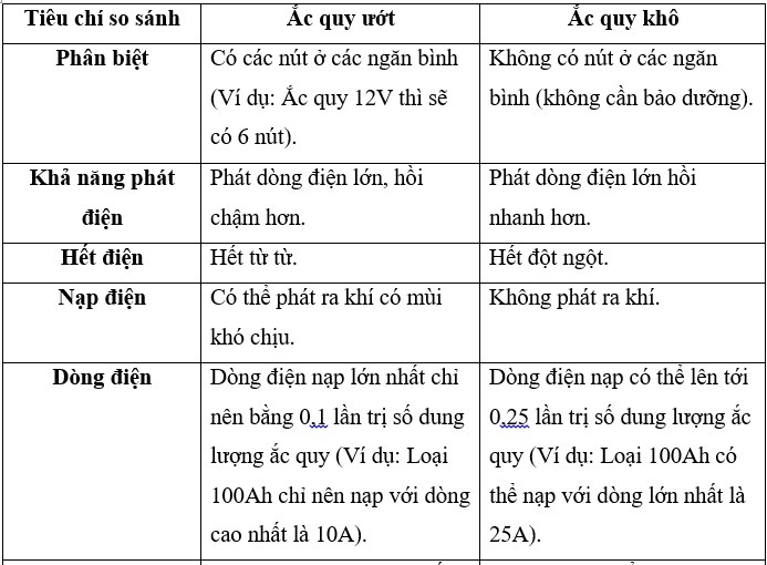 Dưới đây là so sánh về ắc quy khô và ắc quy ướt xe ô tô: