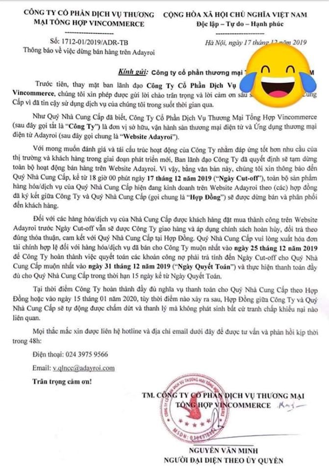 Trên mạng xã hội đang lan truyền hình ảnh một văn bản do Công ty CP DV TM tổng hợp Vincommerce (chủ sở hữu trang adayroi.com) gửi đến đối tác. Theo văn bản này, “với mong muốn đánh giá và tái cấu trúc lại công ty”, Ban lãnh đạo công ty “quyết định sẽ tạm dừng toàn bộ hoạt động bán hàng trên website Adayroi”.