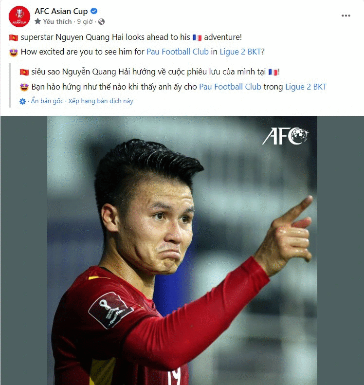 "Siêu sao Nguyễn Quang Hải bắt đầu cho cuộc phiêu lưu của mình tại Pháp. Các bạn có thấy hào hứng khi anh ấy gia nhập Pau FC ở Ligue 2?", AFC gửi lời chúc mừng và đăng tải hình ảnh tiền vệ tuyển Việt Nam.