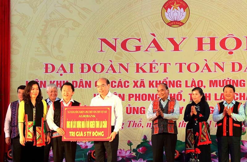 Nhân dịp này, nhằm phát huy vai trò và tích cực thực hiện trách nhiệm trong công tác an sinh xã hội đối với địa phương, nhất là chăm lo đời sống cho các hộ gia đình có hoàn cảnh khó khăn, sớm ổn định chỗ ở, Agribank đã trao tặng 100 căn nhà đại đoàn kết với tổng trị giá 5 tỷ đồng cho các hộ gia đình có hoàn cảnh khó khăn trên địa bàn tỉnh Lai Châu. Với nguồn tài trợ này, tỉnh Lai Châu sẽ phân bổ cho các huyện trong toàn tỉnh và phối hợp triển khai xây dựng mới 100 căn nhà cho các hộ gia đình có hoàn cảnh khó khăn.