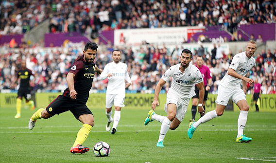 Trọng tài nổi hồi còi kết thúc 90 phút. Tiếp đà thăng hoa, Man City một lần nữa đánh bại Swansea ngay trên sân Liberty nhờ sự tỏa sáng của Aguero (cú đúp) và một bàn khác của Sterling.