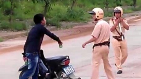| Một thanh niên cầm vỏ chai tấn công cảnh sát giao thông ở Lạng Sơn trong một clip phát trên mạng tháng 6-2012 |