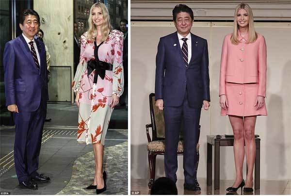 Theo Daily Mail, chiếc váy màu hồng lấy cảm hứng từ kimono mà Ivanka Trump mặc trong bữa tiệc tối với Thủ tướng Nhật Shinzo Abe hôm 3/11 có giá là 1.995USD (khoảng 45 triệu đồng).