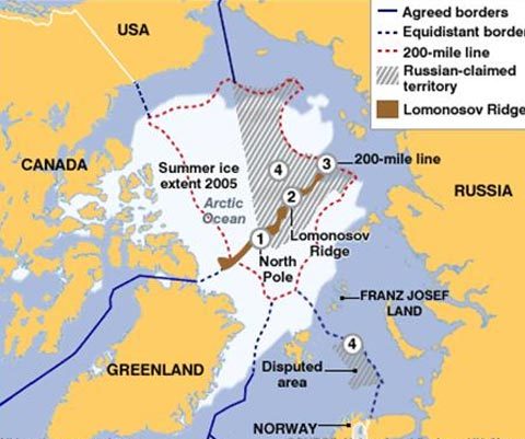 Tuy nhiên, Luật biển cho phép một số quốc gia mở rộng tuyên bố chủ quyền của họ nếu thềm lục địa của nước đó kéo dài sang các vùng biển quốc tế vượt ngoài các khu vực EEZ. Theo điều khoản này, Nga đã tuyên bố chủ quyền đối với các tài nguyên trên đáy biển và biển xung quanh dãy núi Lomonosov - một dãy núi dưới nước vắt ngang qua Bắc Cực.