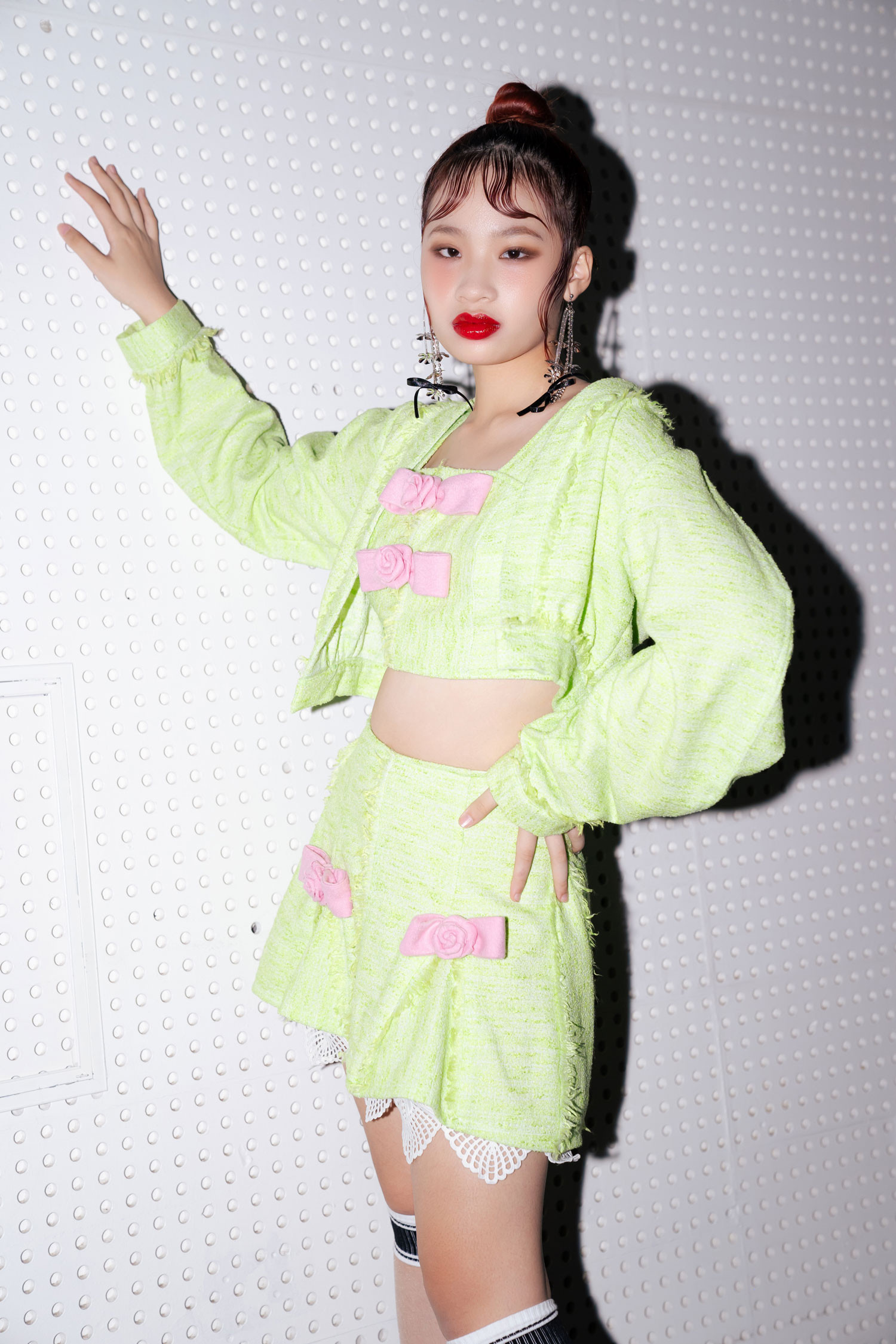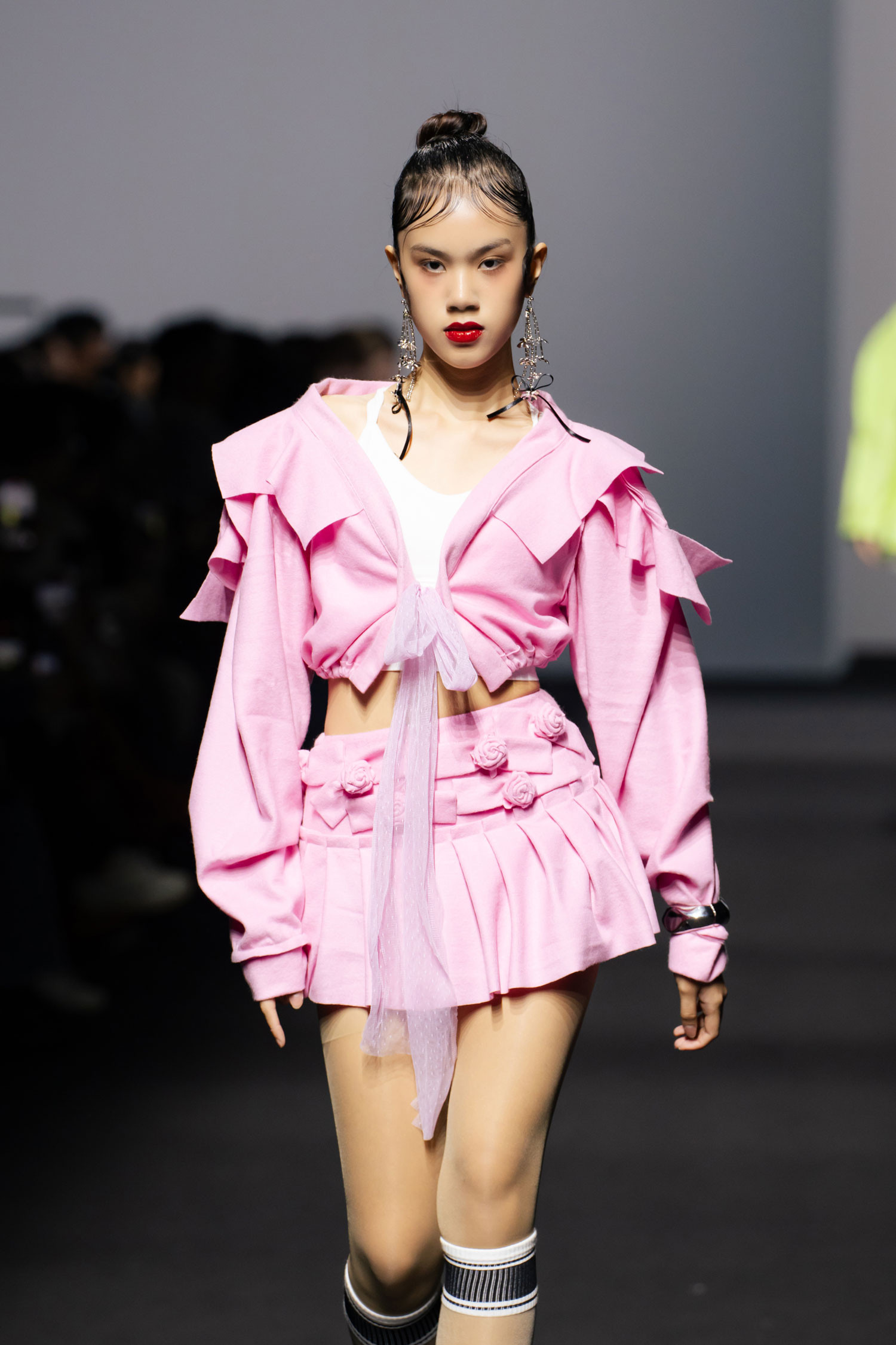 Almira Bảo Hà được giao trình diễn hai thiết kế: áo blazer dáng lửng phối chân váy ngắn và set crop top đi cùng chân váy xếp ly theo phong cách trẻ trung. Hai trang phục có màu sắc khác nhau, được Bảo Hà biến hóa cách catwalk cho phù hợp.
