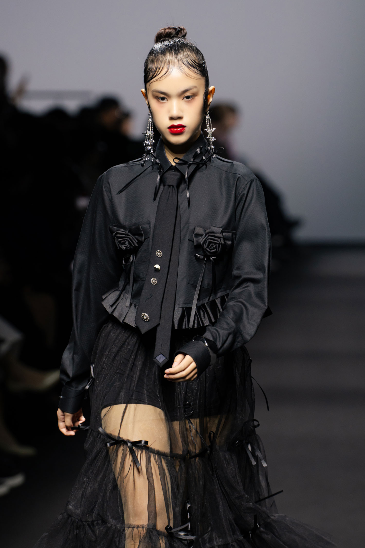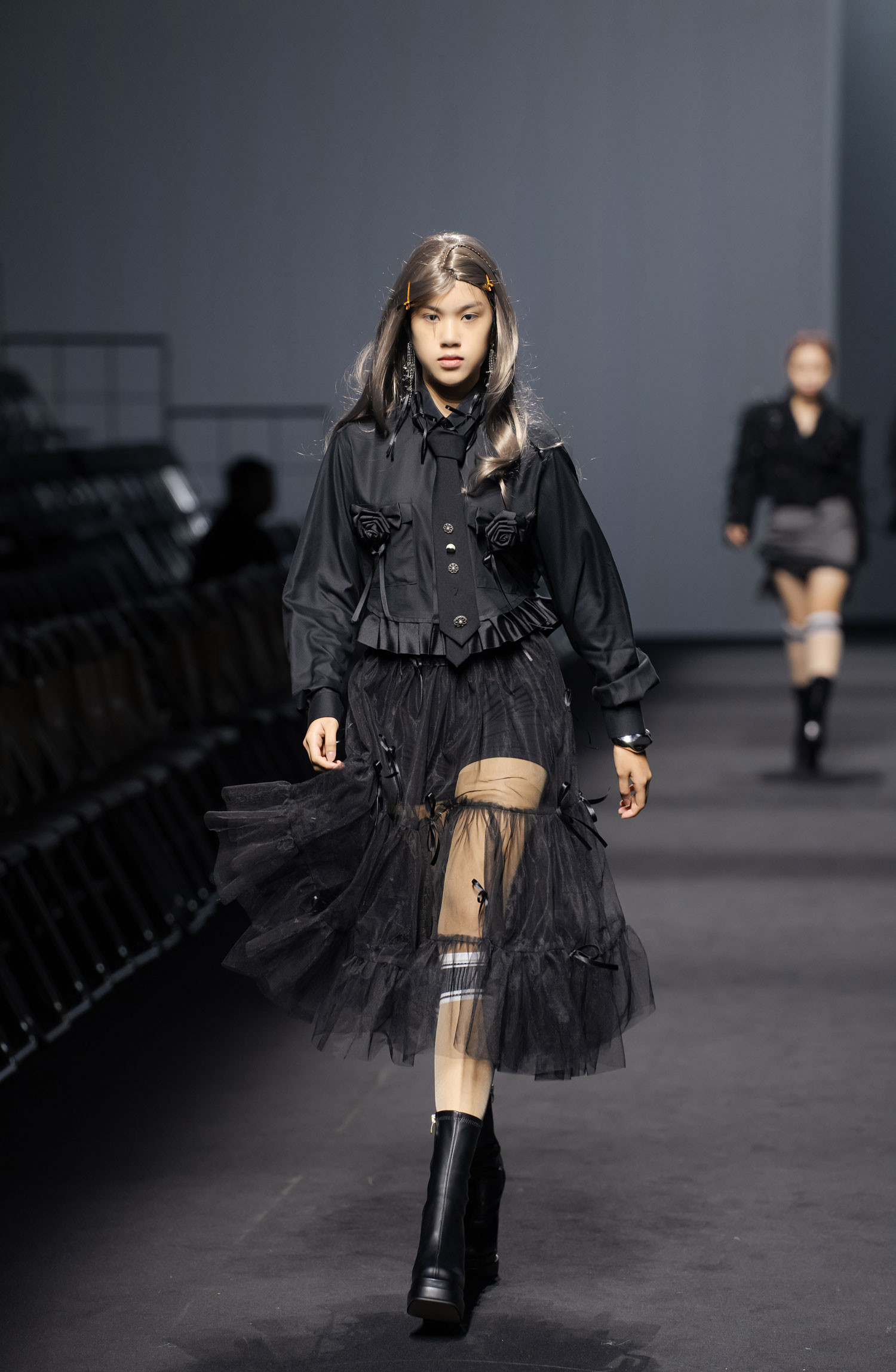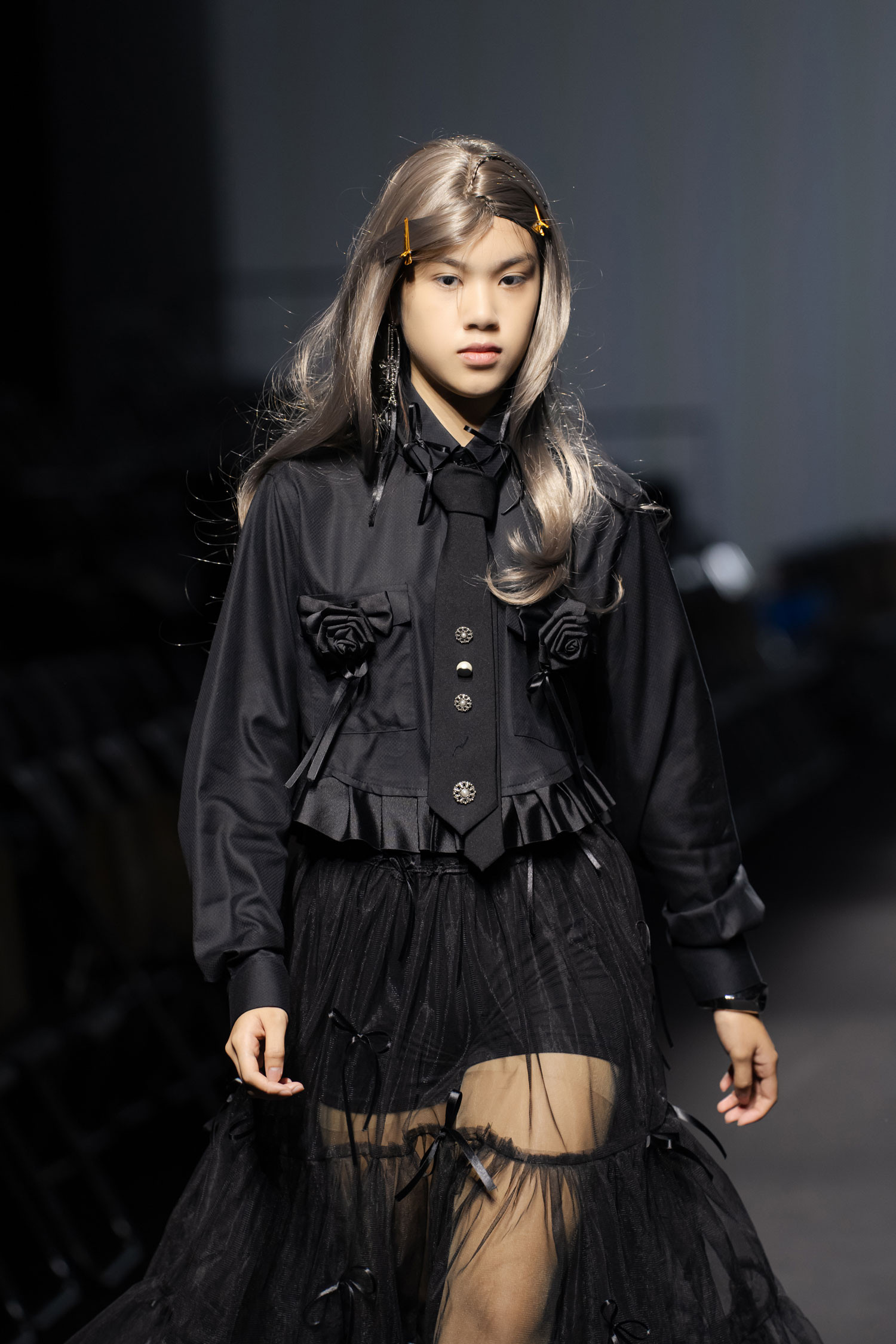 Kelly Ngọc Anh lúc bí ẩn cùng sơ mi đen, chân váy xuyên thấu, lúc năng động với trang phục tông hồng ngọt ngào. Mẫu nhí còn chinh phục đôi giày cao gót 15cm với những bước chân chắc chắn.
