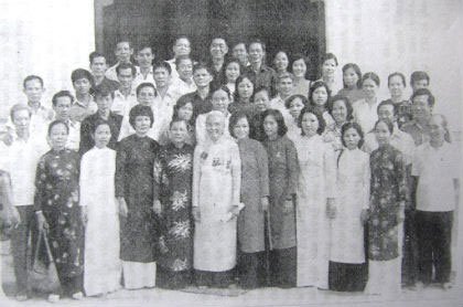 Giám đốc Ba Thi (đeo kính, đứng giữa hàng đầu) và các cán bộ phụ trách các cửa hàng lương thực của TP Hồ Chí Minh trong buổi lễ đón nhận danh hiệu Anh hùng Lao động của bà vào tháng 10-1985. Ảnh chụp lại. |