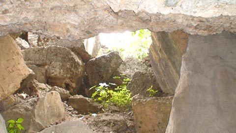 Mon men theo mỏm đồi được mấy trăm mét, hiện ra trước mặt chúng tôi là những tảng bêtông lớn nằm ngổn ngang, nghiêng ngả như sắp lăn xuống. Ông Lợi chỉ tay lên bảo: “Đấy là cửa chính của pháo đài. Ngày xưa nó bị hàng tấn thuốc nổ tàn phá nên giờ mới ngổn ngang thế này”.