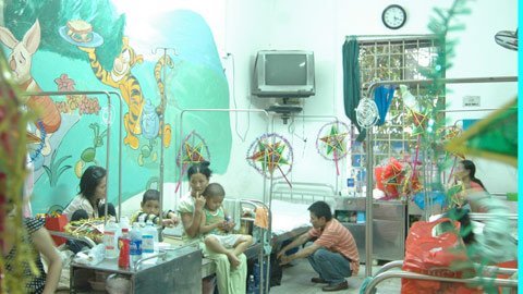 Bé Tiến Anh, quê ở Bắc Giang, bày tỏ nỗi niềm tiếc nuối khi không được xuống sân ngồi cùng các bạn: “Em hơi buồn vì không được rời khỏi giường. Nhưng nằm ở đây, em vẫn nghe được tiếng trống, tiếng nhạc, tiếng cười nói rất vui ở ngoài kia”. Vừa nói dứt lời, Tiến Anh cố gượng dậy, đưa đôi mắt ra phía cửa sổ, nhưng em lại phải nằm xuống ngay vì ống thuốc truyền dở dang treo lủng lẳng trên đầu.