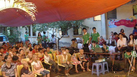 Có mặt từ rất sớm, các tình nguyện viên- hầu hết là sinh viên ở các trường đại học, cao đẳng của hội thiện nguyện “Lá me xanh” đã chuẩn bị chu đáo về mọi mặt: sân khấu, bàn ghế, đèn lồng, bánh kẹo… Khuôn viên của bệnh viện không rộng lắm nên khoảng sân nhỏ nằm ngay phía trước cửa khoa Nhi được chọn làm sân khâu cho đêm trung thu. Như thế, các bé phải nằm lại ở giường bệnh truyền thuốc vẫn được đón nhận không khí ấm áp, vì có thể nhìn qua cửa sổ.