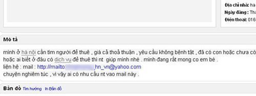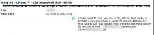 Nickname Kimphuong…@yahoo.com đang có nhu cầu tìm người đẻ thuê trên một diễn đàn mạng với nội dung: “Mình ở Hà Nội, cần tìm người đẻ thuê, giá cả thỏa thuận. Yêu cầu không bệnh tật, đã có con hoặc chưa có con. Ai biết ở đâu có dịch vụ đẻ thuê thì nhắn tin giúp mình nhé. Mình đang rất mong có em bé. Liên hệ mail: kimphuong….@yahoo.com”.