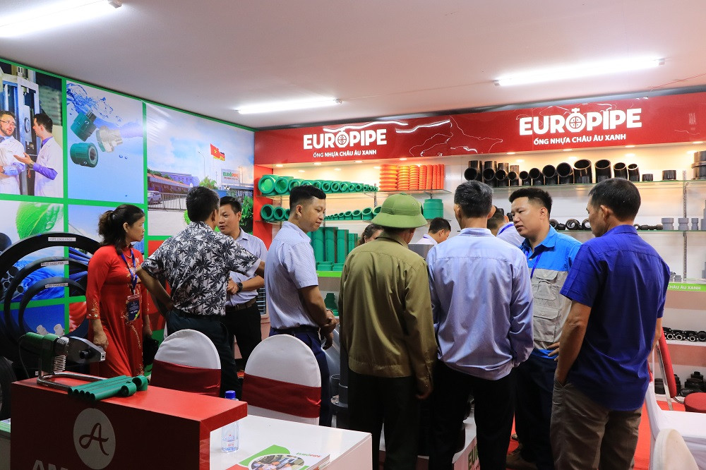 Đầu tiên, gian hàng EUROPIPE gây ấn tượng mạnh tại triển lãm khi trưng bày đầy đủ các dòng sản phẩm ống nhựa và phụ kiện ngành cấp - thoát nước như ống HDPE, PPR, uPVC, ống luồn dây điện, ống cáp viễn thông… Đặc biệt, EUROPIPE có dòng sản phẩm ống HDPE đường kính lớn D900 - D1200 với cấp áp lực cao PN16 - dòng sản phẩm hiếm ở Việt Nam.