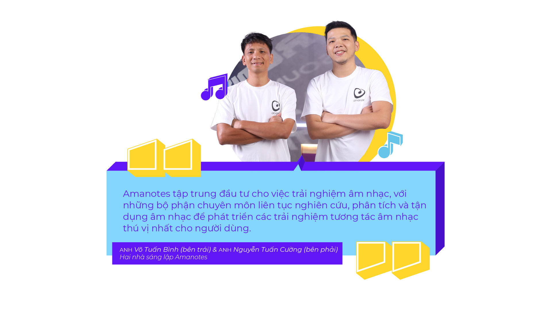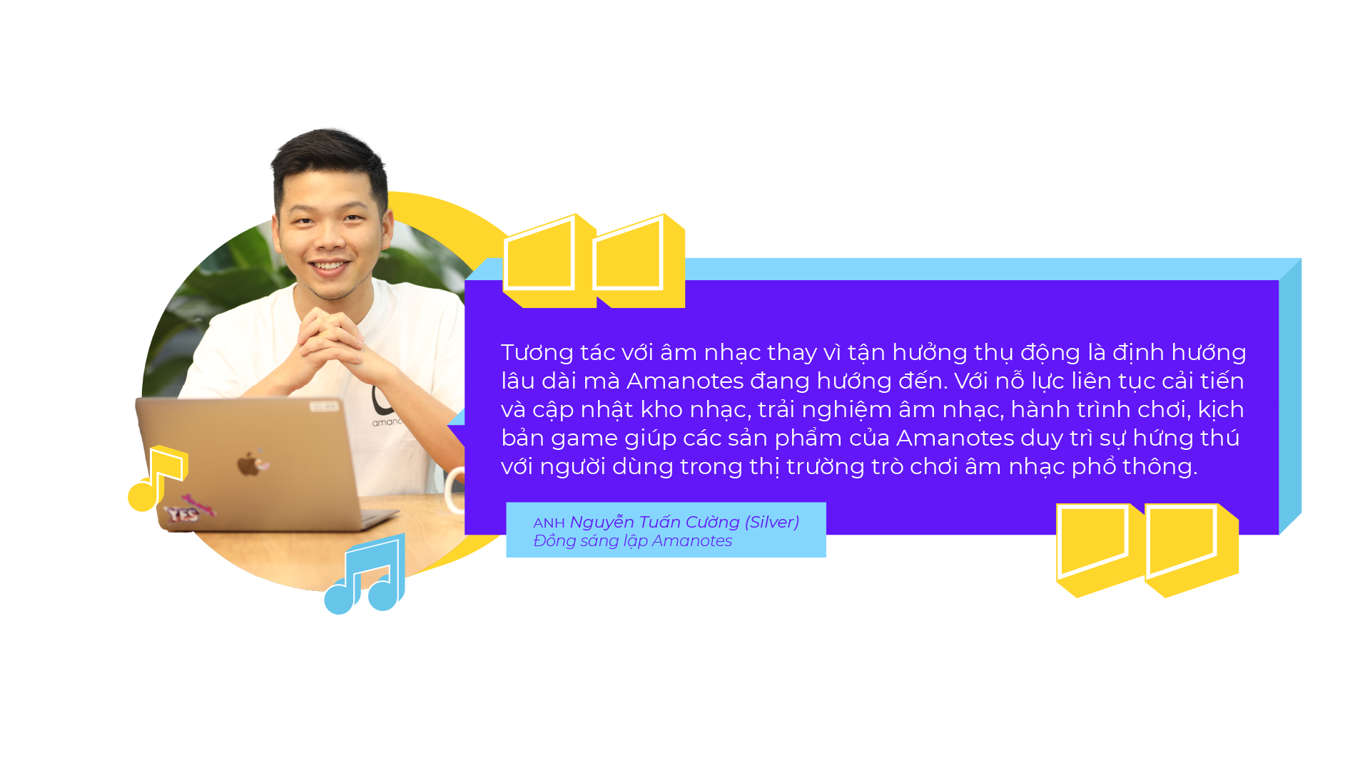 Để chinh phục được mục tiêu này, Amanotes đang đẩy mạnh nghiên cứu và phát triển hai lĩnh vực là ứng dụng tổng hợp trò chơi âm nhạc (Music Game Hub: Game of Songs) và Ứng dụng giáo dục âm nhạc. Đồng thời, Amanotes hiểu rõ tầm quan trọng của đội ngũ nhân sự có chuyên môn cao, kinh nghiệm sâu rộng về music tech và được tạo điều kiện trải nghiệm âm nhạc trong thực tế để hiểu insight thị trường. Đáng chú ý, đội ngũ tài năng của Amanotes có tư duy đặc biệt và khác biệt về âm nhạc, hiểu được thị hiếu của người dùng. Đây là bước đệm chính để Amanotes phát triển sâu về những trải nghiệm tương tác âm nhạc, tăng sự thú vị cho người dùng.