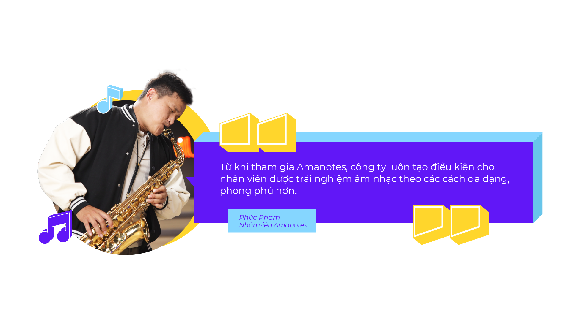 Âm nhạc đang chảy trong huyết quản của Amanotes. Công ty có các hoạt động tiêu biểu như tổ chức buổi hoà nhạc, hỗ trợ các gói đăng ký học nhạc, mua nhạc cụ… để nuôi dưỡng tình yêu âm nhạc đồng thời biến âm nhạc thành DNA của Amanotes. Công ty còn có phòng ban dành riêng cho âm nhạc để tập trung vào việc phân tích và tận dụng âm nhạc một cách chuyên nghiệp nhất, khác biệt với nhiều nhà phát hành trò chơi âm nhạc phổ thông khác.