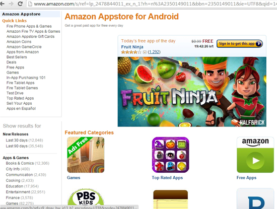 Danh sách các ứng dụng, trò chơi được cung cấp miễn phí từ ngày 30/10 đến ngày 1/11/2014 trên kho ứng dụng của Amazon bao gồm: Các ứng dụng phổ biến (Sonic The Hedgehog 4 Episode I; Fruit Ninja; Plants vs. Zombies; World of Goo; Plex; Endomondo Sports Tracker PRO; Alpha Wave; Eufloria HD; Human Anatomy Atlas; Zombie Gunship; V for Vampire; Lapse It Pro), Tổng hợp ứng dụng và trò chơi (Plex; Fruit Ninja; ai.type keyboard plus; Lapse It; Plants vs. Zombies; Sonic The Hedgehog 4 Episode I; World of Goo; Alpha Wave; Eufloria HD; Endomondo Sports Tracker PRO; Can You Escape – Adventure; Longman Dictionary of Contemporary English 5; Braveland; Boxer Pro; Blocky Roads; CarbsControl; Devil's Attorney; Repix; Toca Town; Human Anatomy Atlas; Easy Voice Recorder Pro; Trivia Crack (Ad Free); Eve of the Genesis; Timers4Me & Stopwatch Pro; Unpossible; Amelia and Terror of the Night - Story Book for Kids; Knock Knock; MoneyWiz - Personal Finance; Hidden Object - Haunted House 2; BeFunky Photo Editor Pro; V for Vampire; Web of Deceit: Black Widow Collector's Edition (Full); ScreenDim Full; Weird Park: Scary Tales; Icebreaker: A Viking Voyage; XnInstant Camera Pro; Zombie Gunship; Gods VS Humans - Protect your Kingdom.