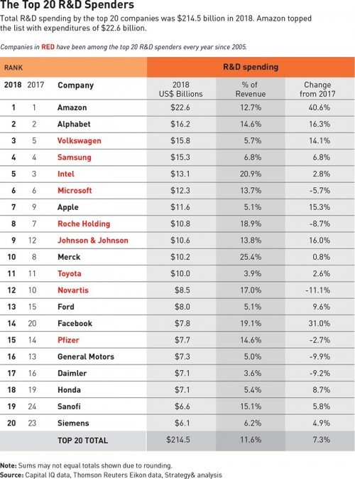 Amazon tiếp tục đứng đầu danh sách này trong năm thứ 2 liên tiếp với việc đầu tư tới 22,6 tỉ USD cho lĩnh vực nghiên cứu và phát triển, vượt xa các tên tuổi còn lại. Alphabet đứng vị trí thứ hai khi đã chi 16,2 tỉ USD, tăng 16,3% so với năm 2017.