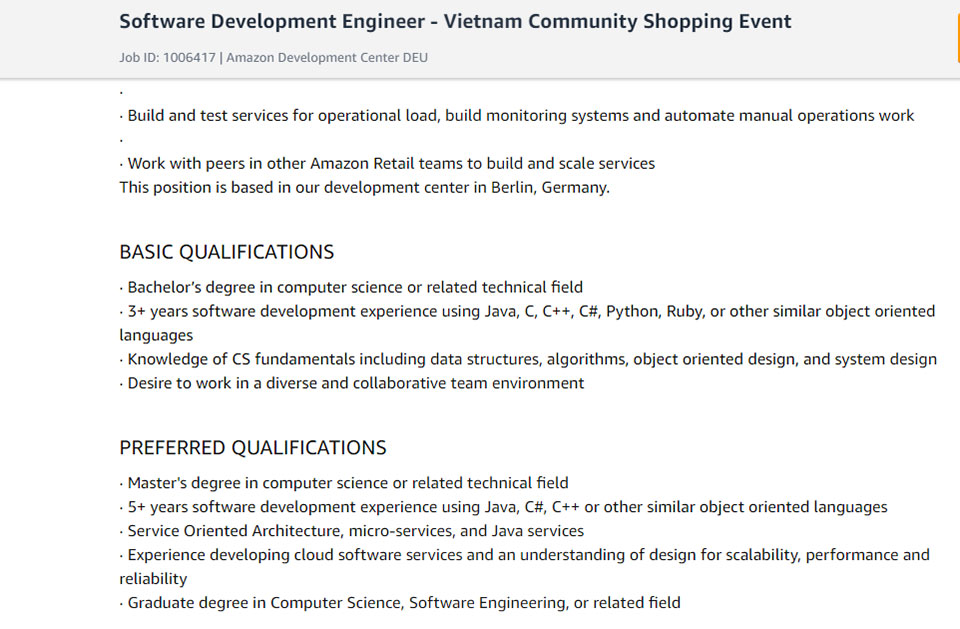 Theo thông báo tuyển dụng, Amazon đang tìm kiếm nhân sự là các kỹ sư phát triển phần mềm cho một trung tâm phát triển mới của hãng đặt tại Berlin, Đức. Bộ phận này sẽ tham gia phát triển những sản phẩm và dịch vụ mới liên quan đến những trải nghiệm cốt lõi của Amazon như đánh giá của người dùng, các giao dịch mua sắm và quà tặng.
