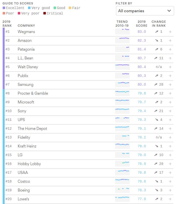 Ví dụ như Samsung đứng thứ 7 trong bảng xếp hạng với số điểm 80, kém hơn con số 82,3 điểm của Amazon. Wegmans đã đứng đầu bảng xếp hạng năm 2019 với 83 điểm. Đây là một chuỗi siêu thị tư nhân của Mỹ có trụ sở tại Gates, New York.