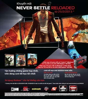 Gói khuyến mãi "Never Settle: Reloaded" lần này của AMD tiếp nối gói khuyến mãi năm ngoái là "Never Settle". Các game bản quyền đi kèm card đồ hoạ AMD lần này khẳng định cam kết liên tục mang đến cho người dùng trải nghiệm game tuyệt vời nhất với những dòng game PC "đỉnh" hiện nay, tối ưu cho dòng card AMD Radeon™.