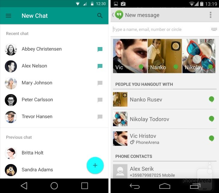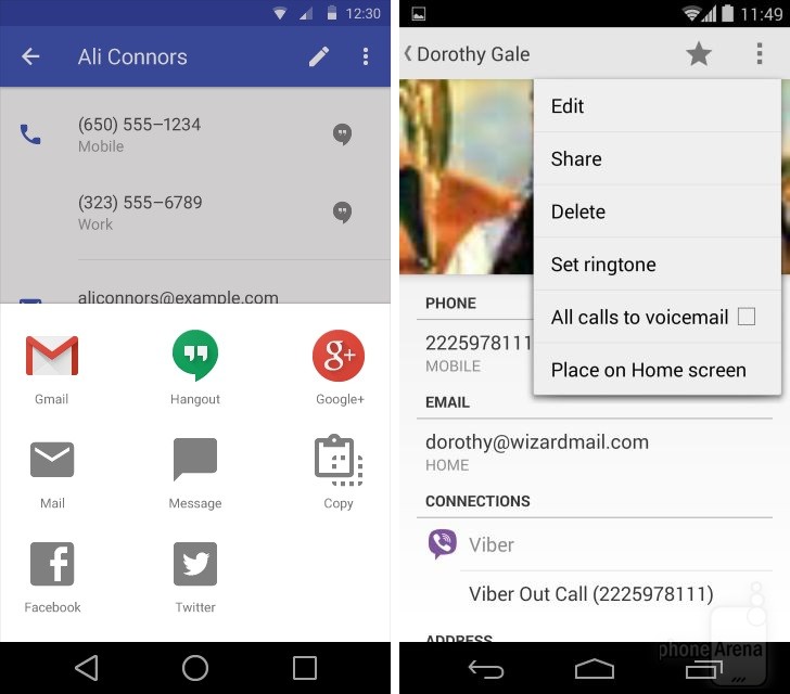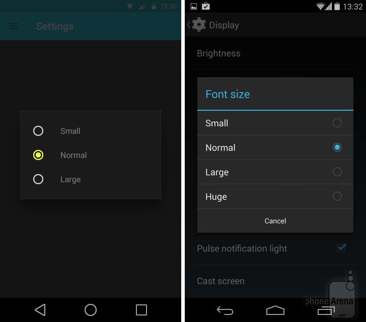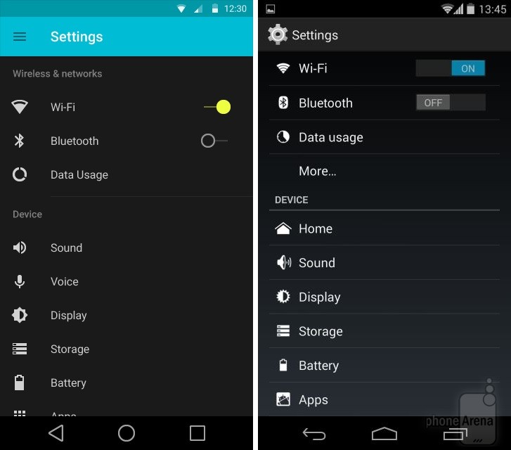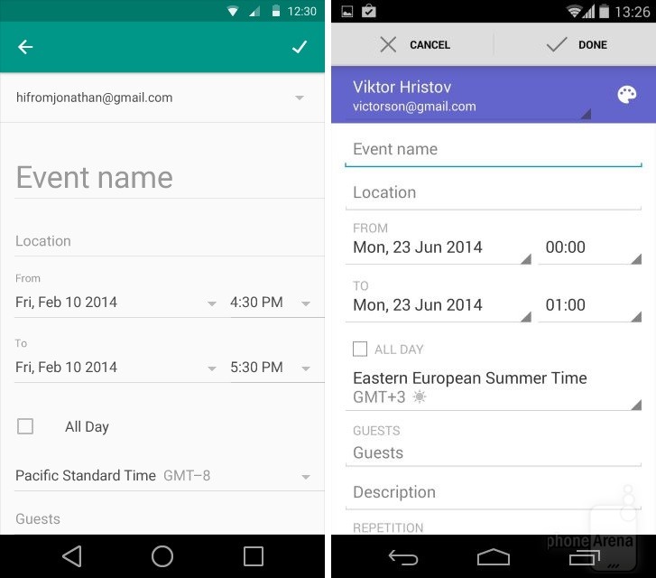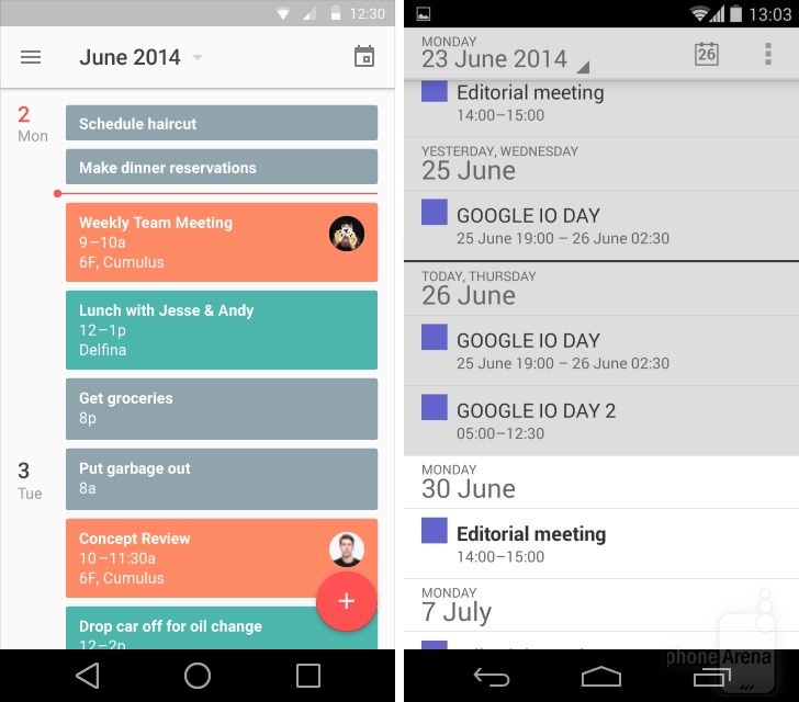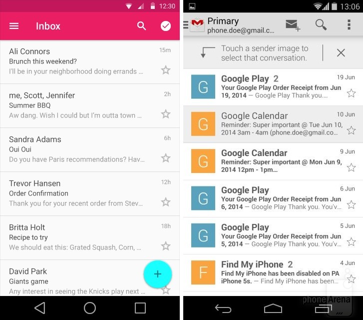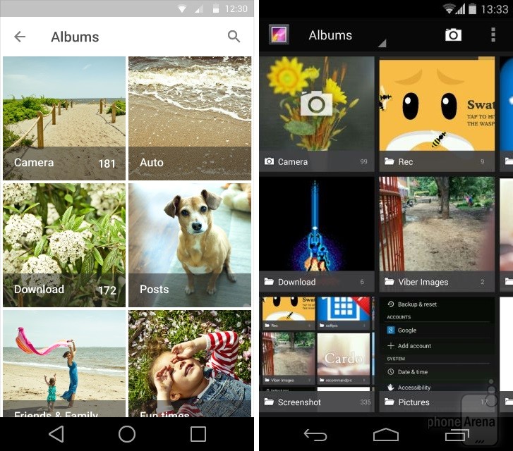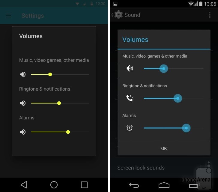 Có thể nhận thấy rõ nhất sự thay đổi trong thiết kế khi đặt Android KitKat bên cạnh Android L. Dưới đây là một số so sánh giao diện các ứng dụng, tính năng giữa hai phiên bản Android (Android L bên trái):