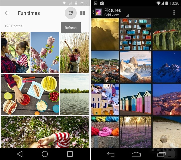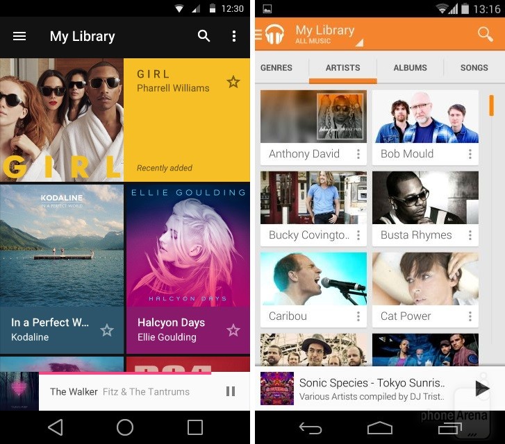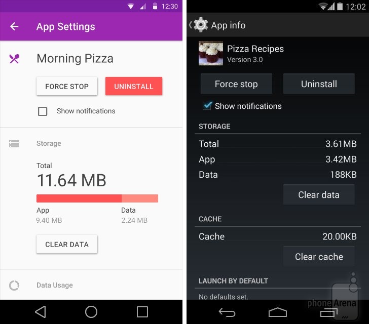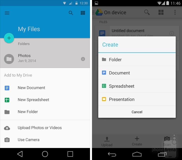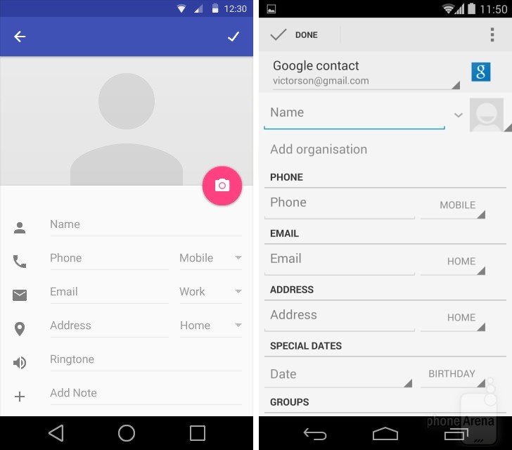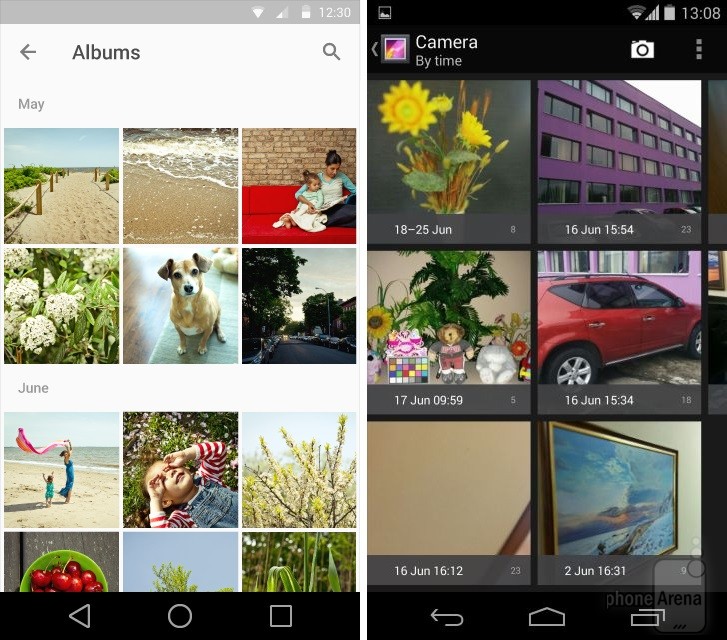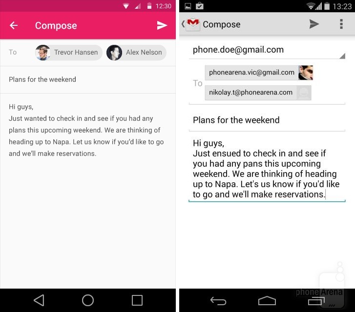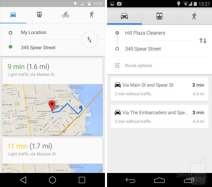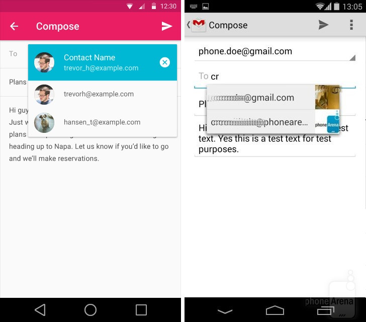 Có thể nhận thấy rõ nhất sự thay đổi trong thiết kế khi đặt Android KitKat bên cạnh Android L. Dưới đây là một số so sánh giao diện các ứng dụng, tính năng giữa hai phiên bản Android (Android L bên trái):