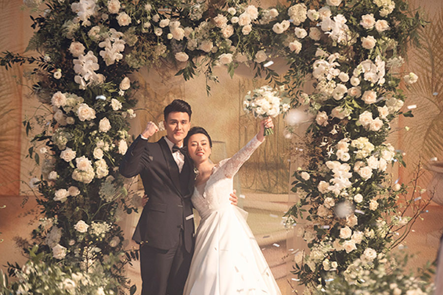 Trong bộ tuxedo lịch lãm, Vĩnh Thuỵ trong trang phục chú rể vô cùng điển trai, gương mặt ngập tràn hạnh phúc trước giờ vào lễ đường kết hôn với ‘cô dâu’ Phương Oanh. Cả hai cùng nắm tay, thề nguyện và trao nhau nụ hôn đắm đuối trong thời khắc chính thức nên vợ nên chồng.