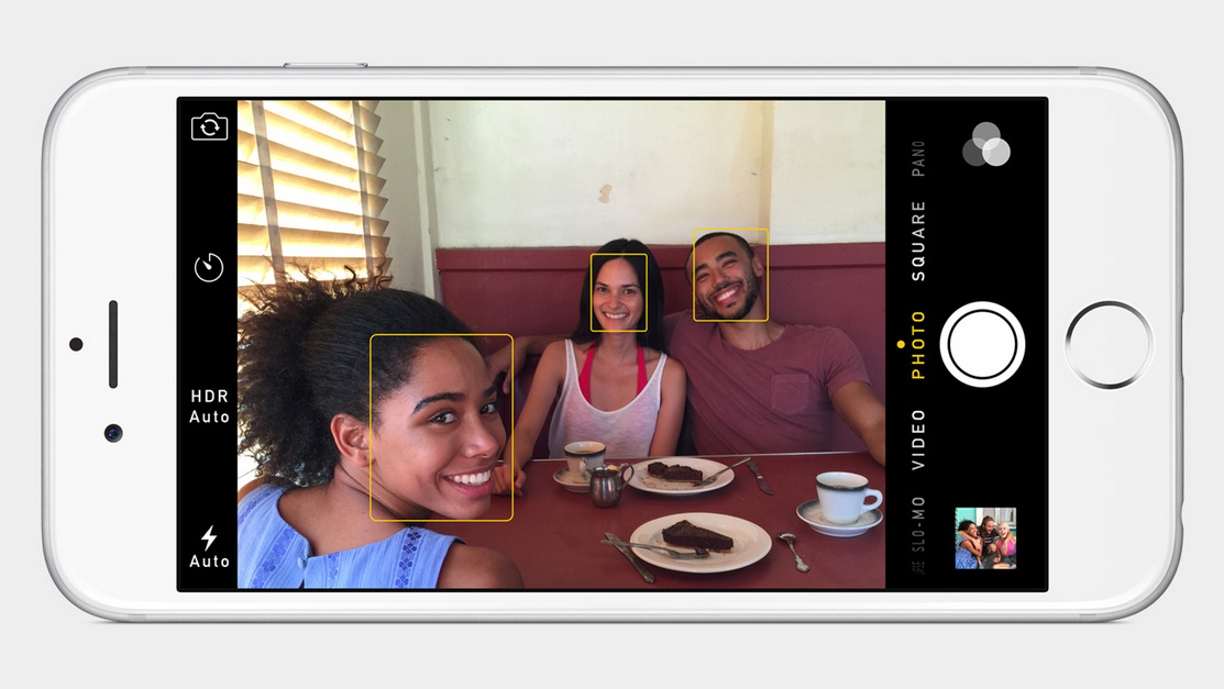 Cảm biến máy ảnh trên iPhone 6 và 6 Plus giữ nguyên độ phân giải như iPhone 5s song được nâng cấp về chế độ lấy nét theo pha (Focus Pixels), cho tốc độ lấy nét và chụp hình nhanh hơn. Trong khi các đối thủ Android đều đã dùng cảm biến 13MP, Apple vẫn tự tin máy ảnh 8MP không hề thua kém. Ngoài ra, bạn có thể chụp ảnh toàn cảnh (panorama) dung lượng lớn hơn, lên tới 43MP.