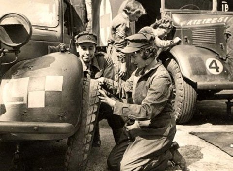 Bức ảnh chụp vào tháng 3/1945, khi Nữ hoàng Anh tương lai đang thay lốp cho xe tải, trước sự quan sát của Trung tá Mildred