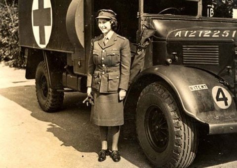 Công chúa Elizabeth mặc quân phục đứng bên một chiếc xe cấp cứu Austin K2