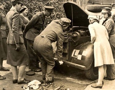 Ảnh được chụp tại Khu huấn luyện vận tải cơ khí ở Camberley, Surrey (Anh quốc) vào ngày Vua George VI, Hoàng hậu, và Công chúa Margaret tới thăm.
